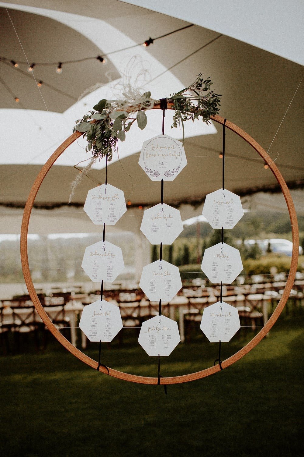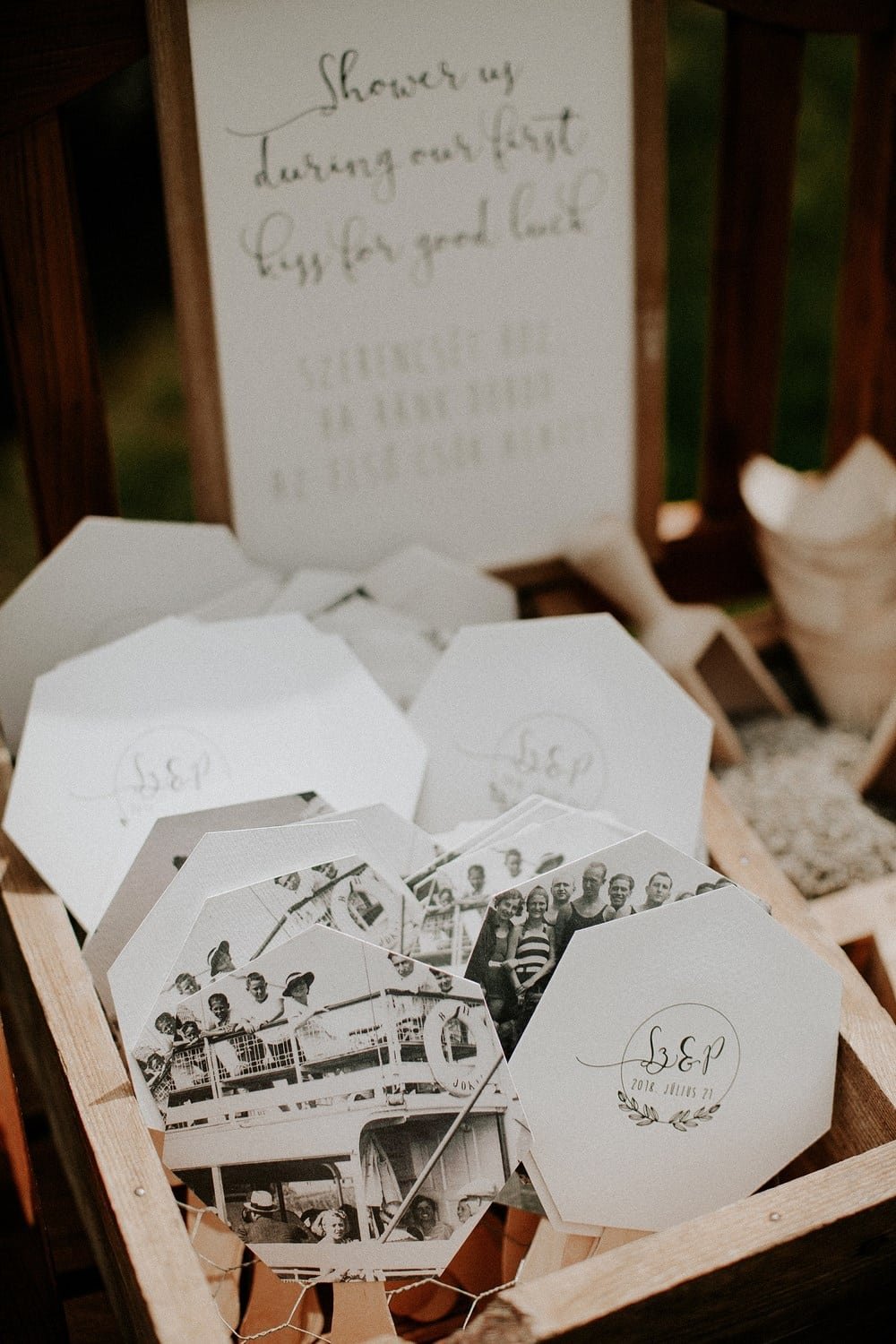 A boldogságkapu is visszatérő elem volt, melynek 7 szögletű formája nemcsak a kapuban, hanem a grafikai anyagokban is megjelent. A menük, asztalszámok és az ültetési rend mind 7 szögre vágott formában kerültek kialakításra, így az esküvő vizuálisan is harmonikus lett.