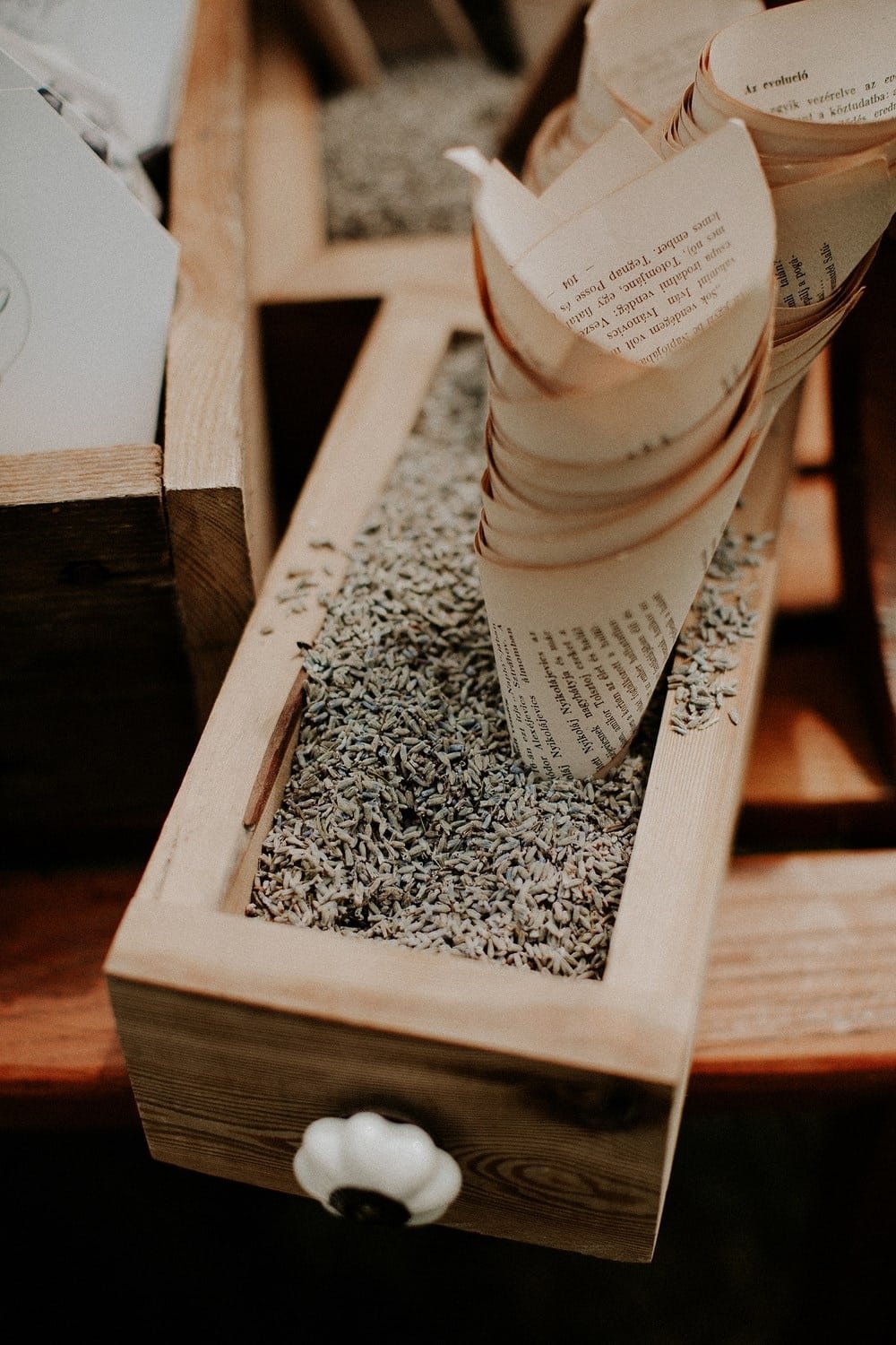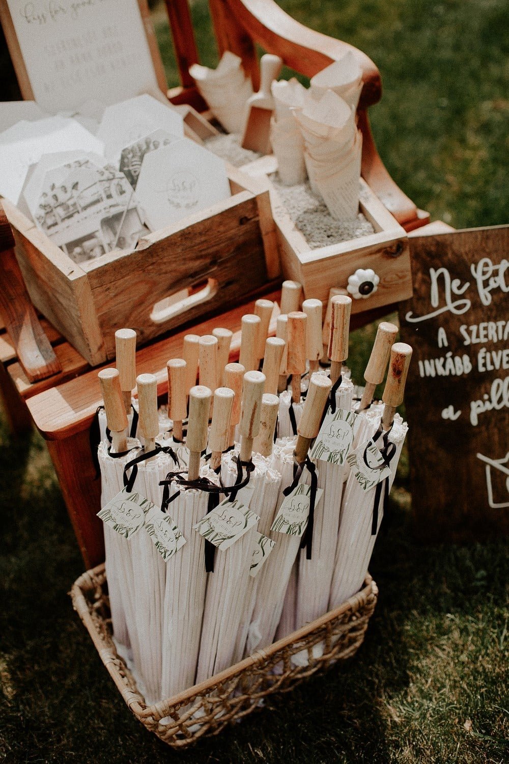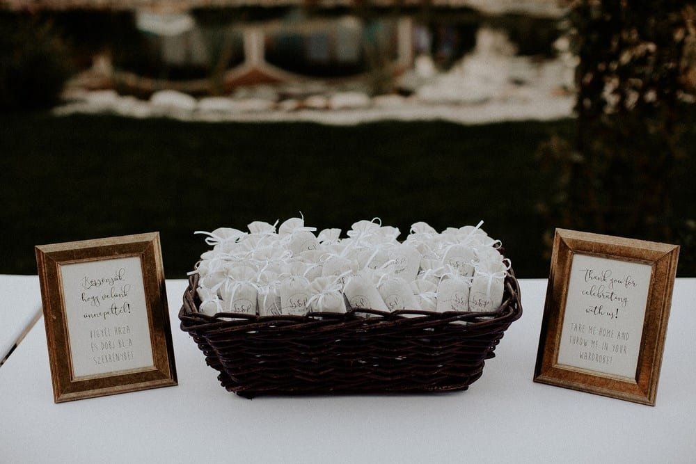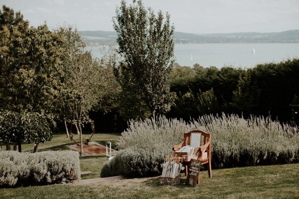 A helyszín további különlegességei közé tartoztak a rizspapiros napernyők és a légies legyezők, amelyek tökéletesen illeszkedtek a kert hangulatához. A vendégek önkiszolgáló módon szórhatták a levendulát, így még egy személyes, egyedi érintést adtak a szertartásnak.