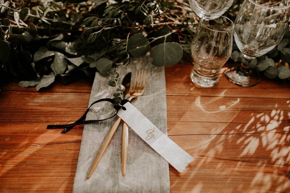 A fekete szín dominálta a dekorációt, és több elemen is visszaköszönt: a meghívót fekete szalaggal kötöttük át, a menyasszonyi csokron is fekete szalag volt, és még az evőeszközöket is ezzel a finom részlettel tettük egyedivé.