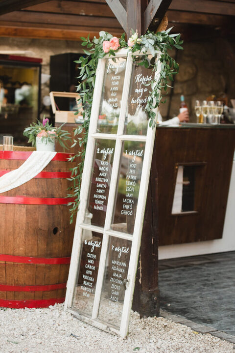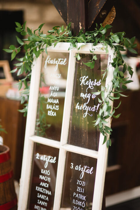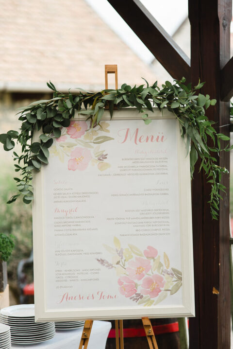 Az ültetést egy ablakra írtuk rá, ami akkor nagyon menőnek számított. :D A menü sem az asztalon volt egyesével, hanem egy nagy menü tábla volt kirakva a bejárathoz, a meghívóval és minden egyéb más grafikával megegyező stílusban.