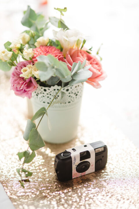 Az asztalokon egyszer használatos fényképezők kerültek amit mi a dizájnhoz passzoló papírba csomagoltunk.