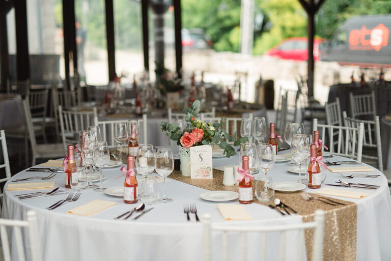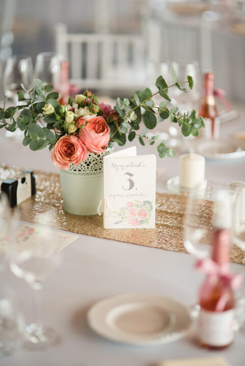 Ancsiék esküvője a Rókusfalvy Birtokon volt, Etyeken. A hely rusztikus környezetét Ancsi a menta, a rózsaszín és az arany színekkel szerette volna megbolondítani. Elég konkrét elképzeléseik voltak, amit mi igyekeztünk a legpontosabban megvalósítási. A személyes virágokat Szűcs Flóra (SzucsFlo) készítette a párnak.