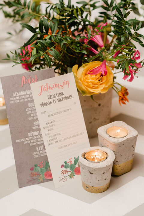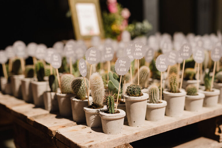 Dóriék nagyon egyedi és kreatív esküvői témát választottak, két téma köré csoportosult az esküvő: beton és kaktusz.