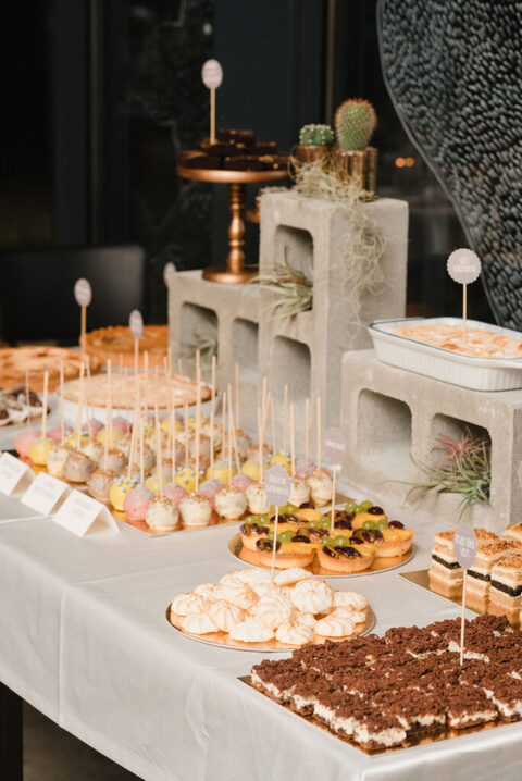 A teremben lévő asztaldíszek is a közös betonöntésen készültek, illetve a teljes koncepció érdekében a limonádé és a desszertbár is beton zsalukövekkel volt kiemelve.