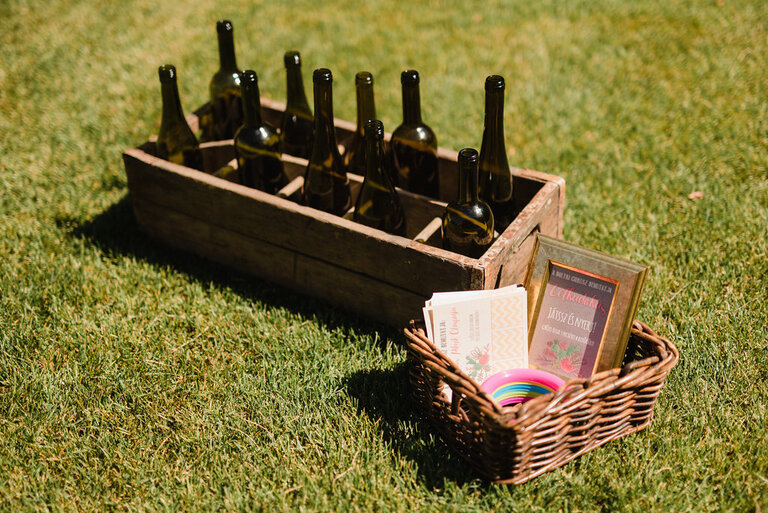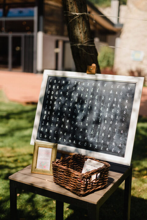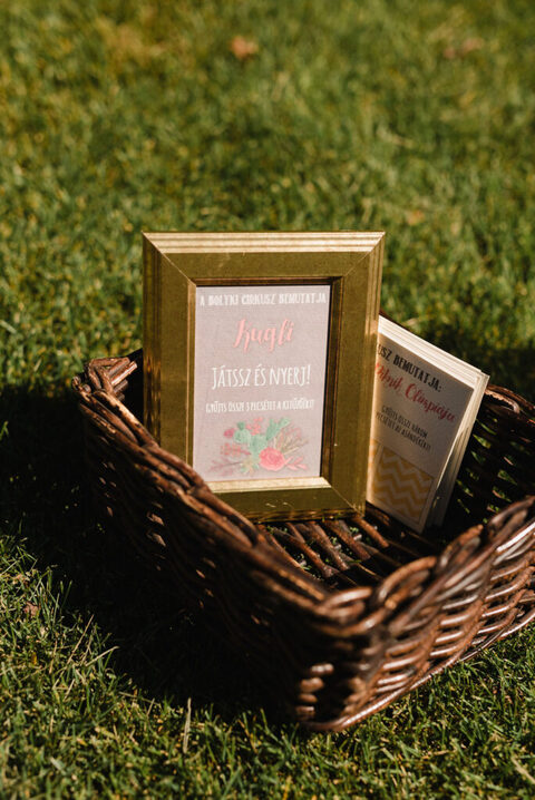 Ezen az esküvőn is nagy hangsúlyt fektettünk a vendégek szórakoztatására, nem volt üresjárat: amíg a fotózások zajlottak piknikjátékokat (üvegdobáló, szókereső) játszottak a vendégek a réten, amelyekkel pecséteket lehetett gyűjteni minden állomáson, és akinek összegyűlt négy pecsét kapott egy kitűzőt.
