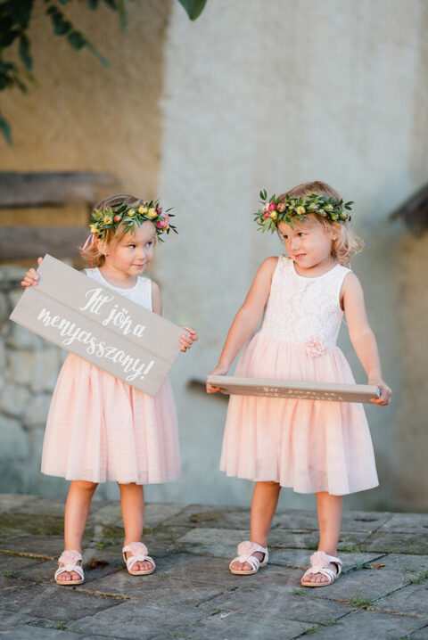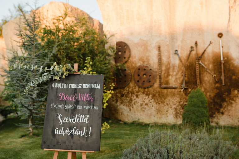 A bútorok kapcsán helyi bútorokat használtunk, hiszen tökéletesen illettek a stílushoz és a helyszínhez. A pár székére és a bevonuláshoz két ikerkislánynak szürke táblákat készítettünk, amiknél a szürke szín is a beton színét tükrözte, ezzel is törekedtünk a koncepció teljességére.