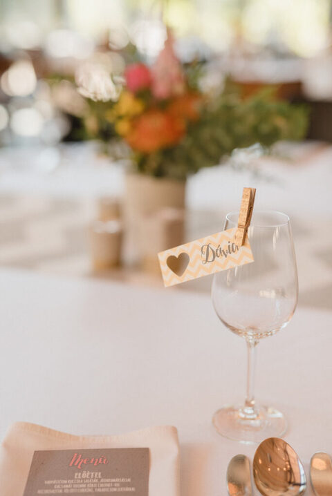 Az asztalszámok is nagyobb beton virágkaspókra voltak feltüntetve, a névkártyákat pedig a pohárra csíptettük fel.