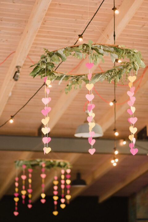 A mennyezetre izzós fényfüzéreket rögzítettünk, ami teljesen megadta az este hangulatát, a tánctér fölé pedig színes szívfüzért helyeztünk el.