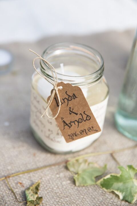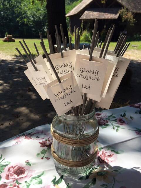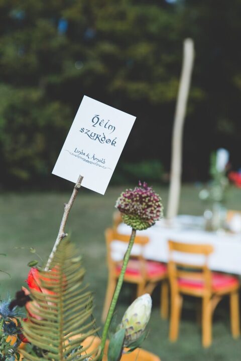 Az esküvő alatt hobbit betűket és tünde szimbólumokat használtunk. Az asztalokat nem számokról, hanem Középfölde helyszíneiről neveztük el, így az ültetési rend is egy nagy térkép volt. Gyűrűk Ura idézeteket ragasztottuk az asztalon lévő befőttesüveges mécsestartók köré, ezek pedig világítottak este a sötétben. A névkártyák Lórien levelei voltak (borostyánlevelekre írt nevek).