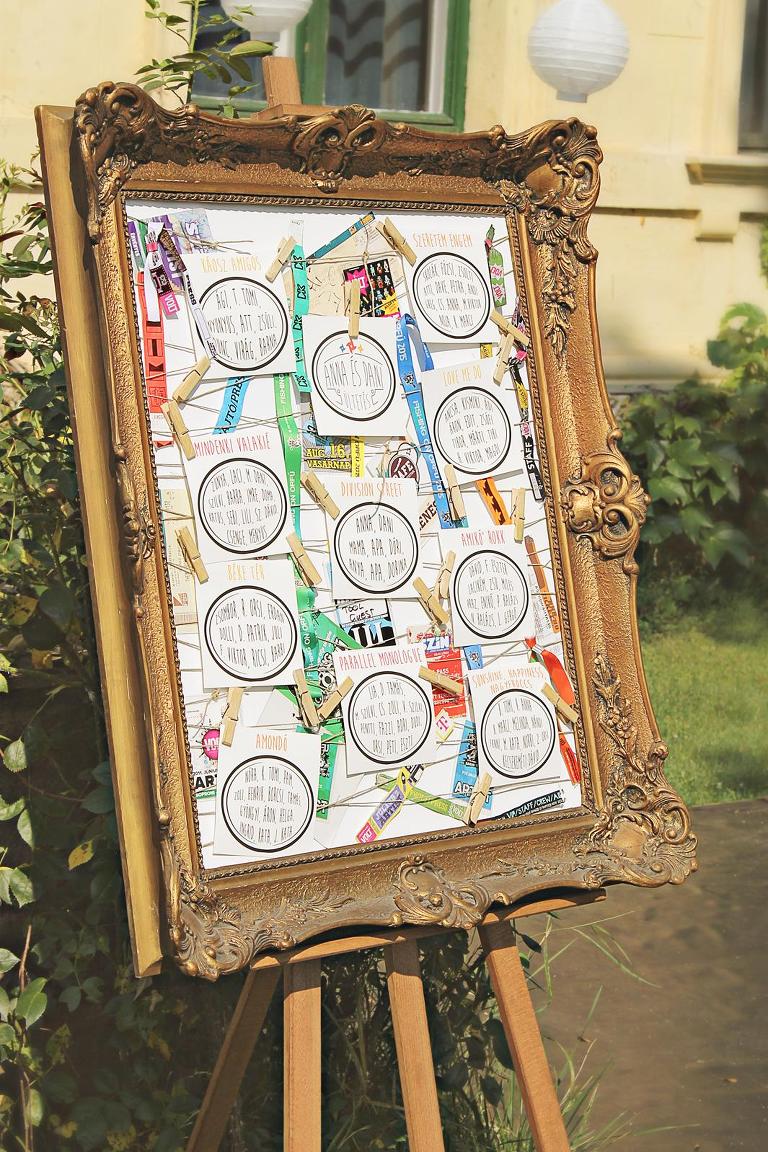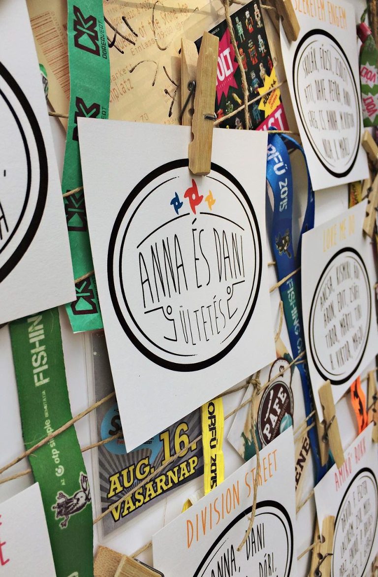 Az ültetési renden a kastélyhoz passzoló arany keretben különböző kártyák mutatták, hogy ki hol ül, a hátteret pedig Annáék saját régi karszalagjai és koncert belépői adták.