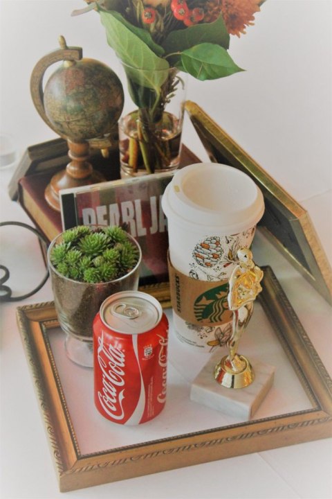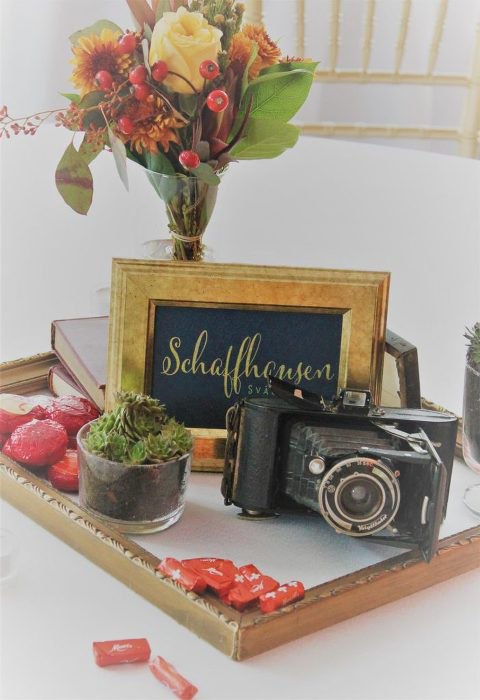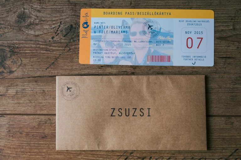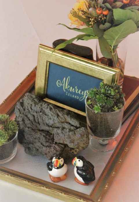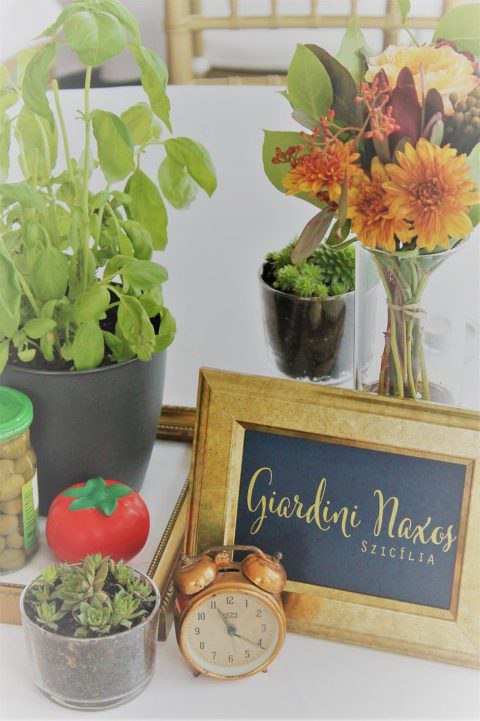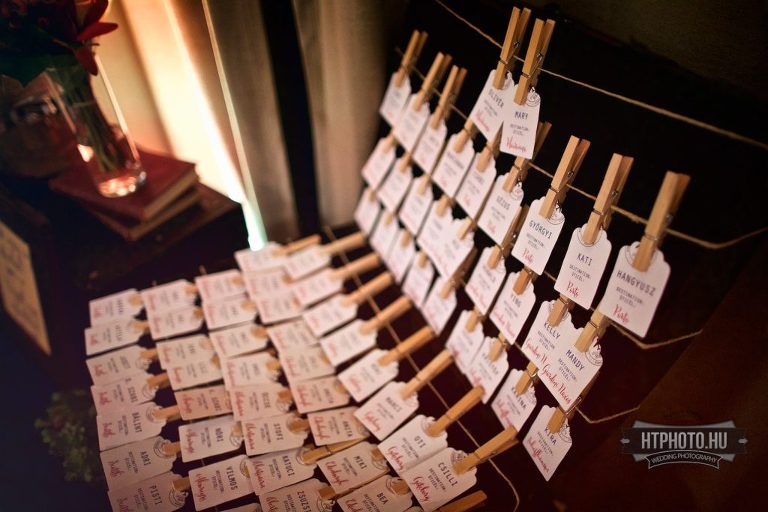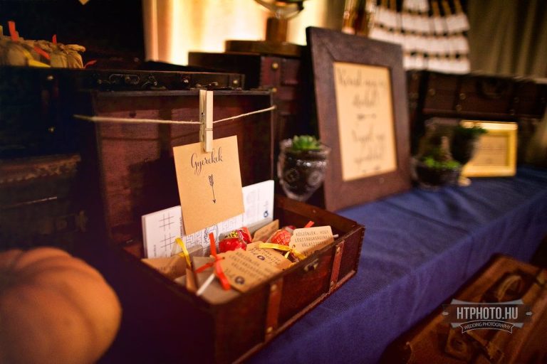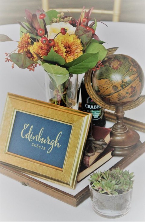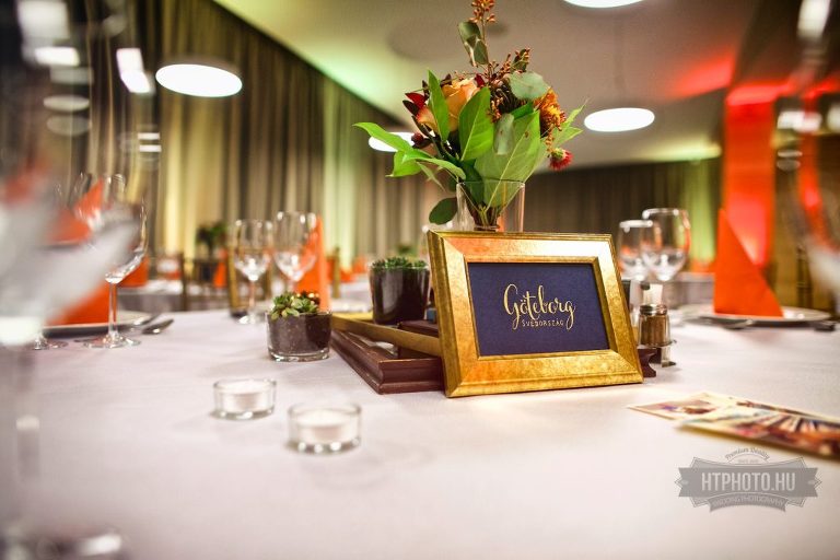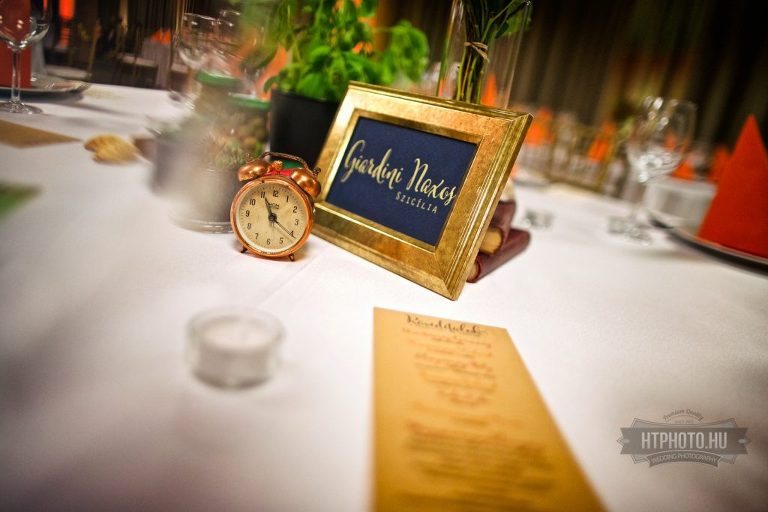 Az utazás tematikára utalt már a beszállókártyás meghívójuk is, az asztalszámok helyett pedig olyan helyekről voltak elnevezve az asztalok, ahogy a Mary-éknek egy-egy emlékezetes utazásuk volt. Az asztaldíszeket általuk hozott helyi dolgokkal egészítettük ki.