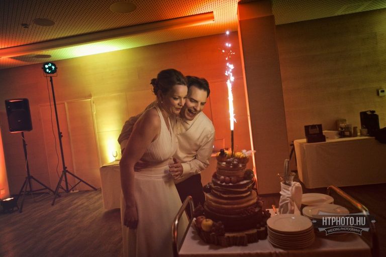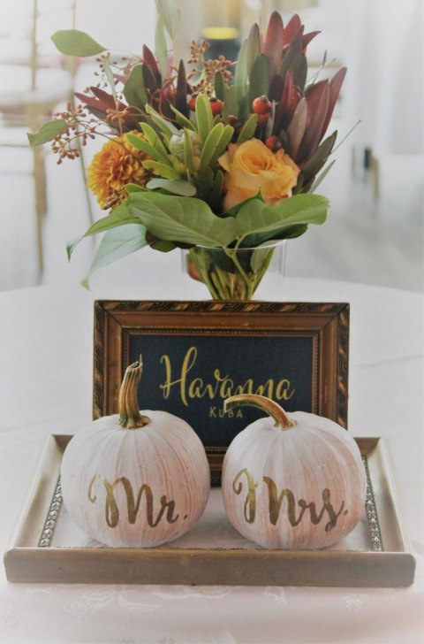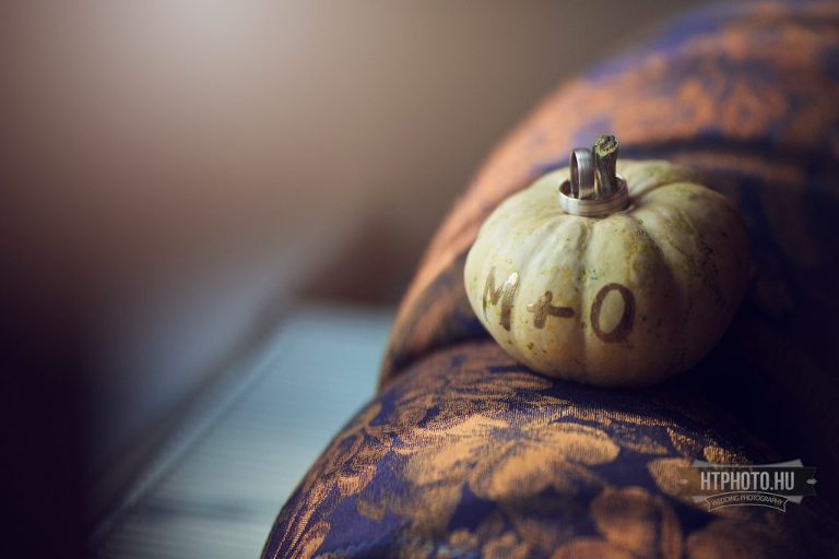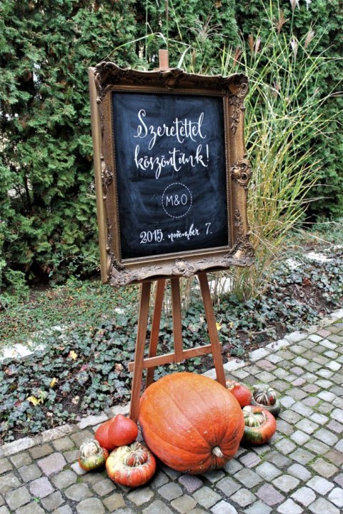 A tökök mindenhol jelen voltak: a köszöntő táblánál, ültetési rendél, és az asztalokon, de például a gyűrűtartó is egy kis tök volt, illetve a torta tetején is egy vőlegény és egy menyasszony tök állt. A szertartás után nem szirom, hanem színes falevél szórás volt, illetve a virágokat is ezekből a színekből válogattunk.