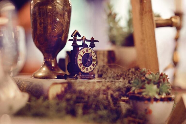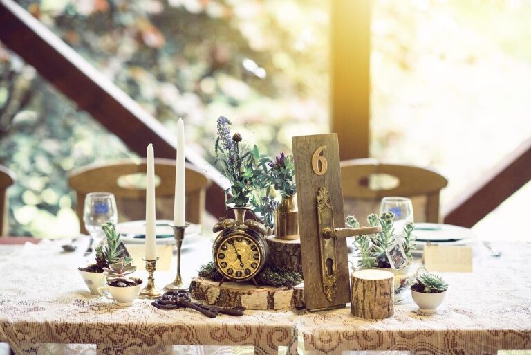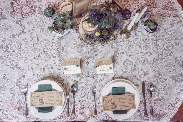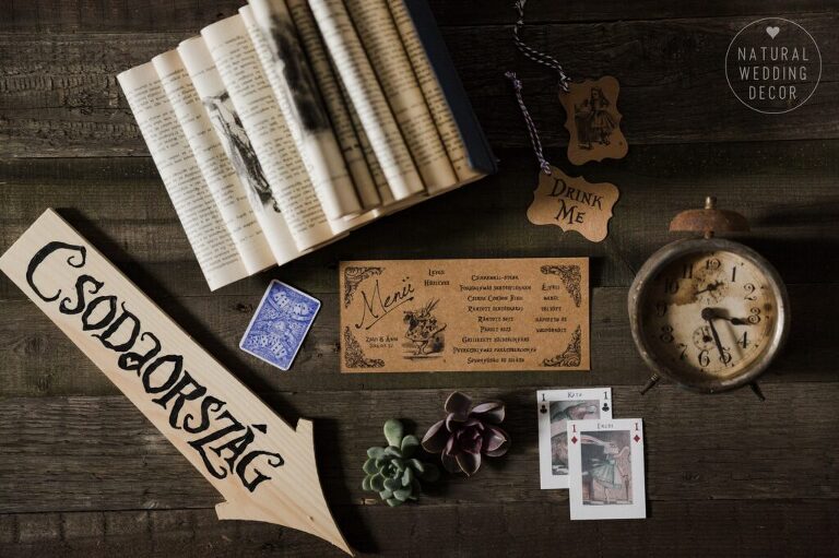 Az asztalok Alíz, csodaországban hangulatot kaptak: mohával benőtt órák és teáscsészék, az asztalszámok pedig kilincses “ajtódarabok” voltak. Az ültetési rend könyvekbe bújtatott kártyákból állt: mindenki megkereste a sajátját, és a kártya száma jelezte az asztalt.