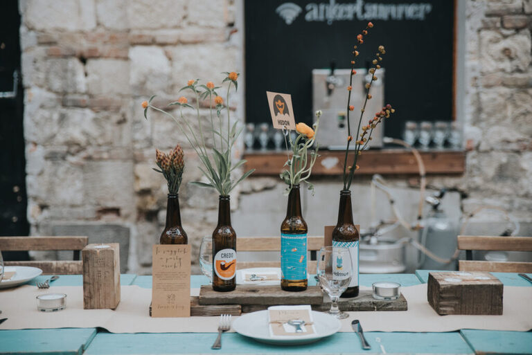 Mindegyik asztal 1-1 sörfőzőről kapta a nevét, virágokat az adott sörfőzőnek a sörösüvegeibe raktuk az adott asztalon. Ehhez kb. 30 üveg sört meg kellett vennünk, hogy az üveg meg legyen mindegyik asztalhoz, ezeket hetek alatt elfogyasztottuk, így a megüresedett üvegeket fel tudtuk használni a dekor elkészítéséhez. :D