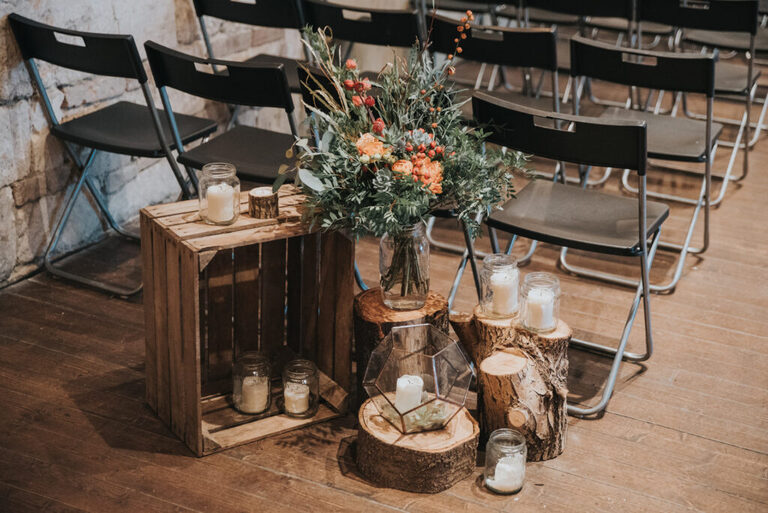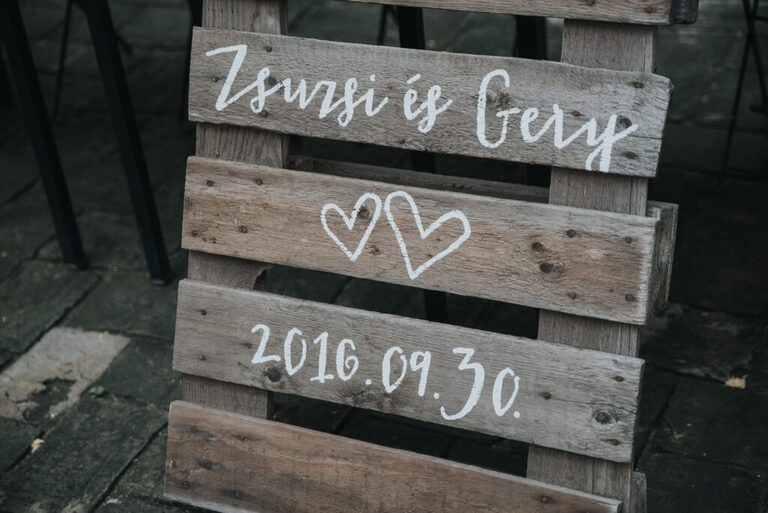 A szertartáson papírra írt hátteret készítettünk, kézzel írtam fel a szeretlek szót nagyon sok nyelven. :) A virágok tekintetében lehetett őszies témában gondolkodni, így nagyon örültem, hogy ismét lehetett színes virágokat, bogyókat beleilleszteni a dekorba. Mécsestartókat raklap kockából készítettük, imádtam ezt a feladatot. :)