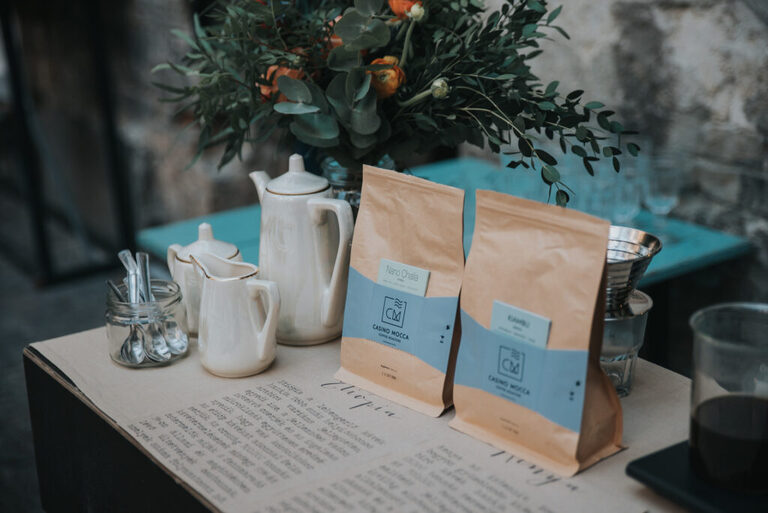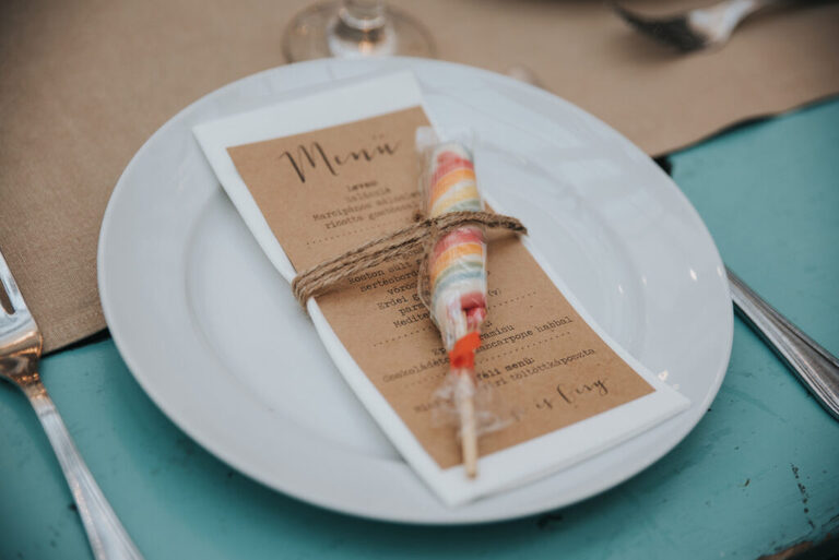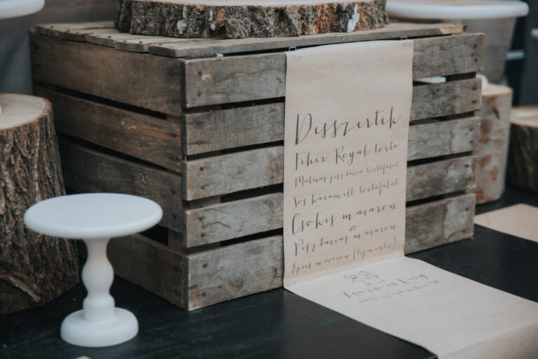 A desszertek neveit is ugyanolyan papírra írtuk, mint amilyen a szertartáson is a háttér volt. A desszertek mellett a pár nagy kávé imádó, így egy kávés pult is volt az esküvőjükön. A kávékról az információkat is ugyanabban a stílusban írtuk kis papírokra, mint a desszertek neveit.