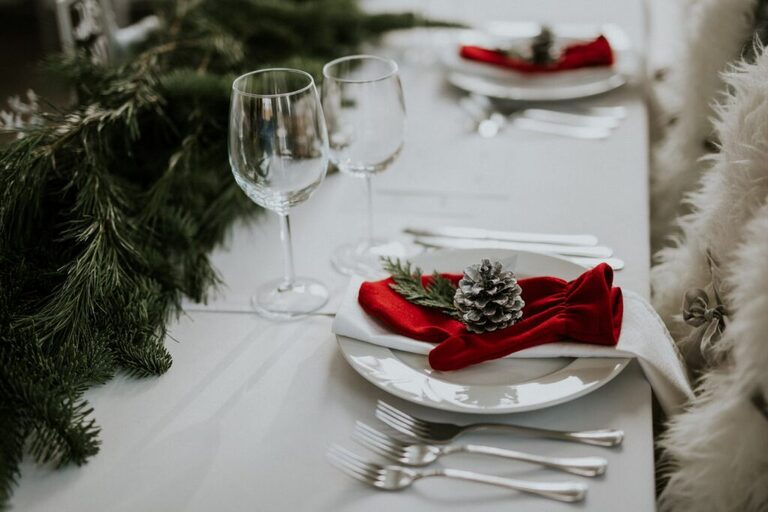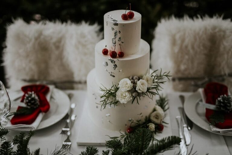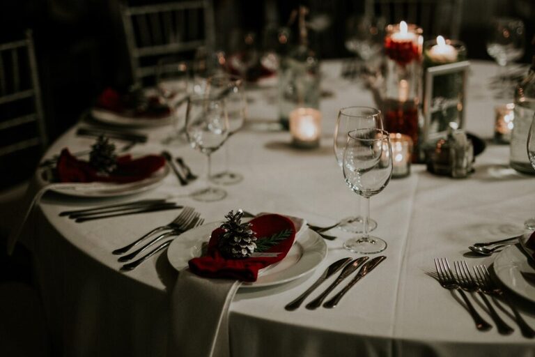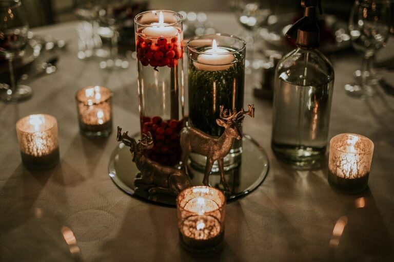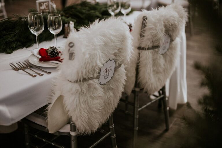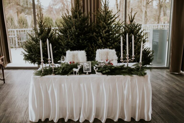 Maga a dekor teljes mértékben a téli vonalra épült, piros bogyókkal, fenyőkkel, ezüst színekkel díszítettünk. Asztal dekorként ezüstre fújtunk szarvasokat, az ültetőkártyákat tobozokhoz ragasztottuk, illetve úszógyertyákat helyeztünk a vázákba. Bea a menüt pompás lakoma fogásaiként fogalmazta meg. A főasztal székeit műszőrrel borítottuk, a terítékekre pedig piros kis kesztyűk kerültek köszönőajándékként.