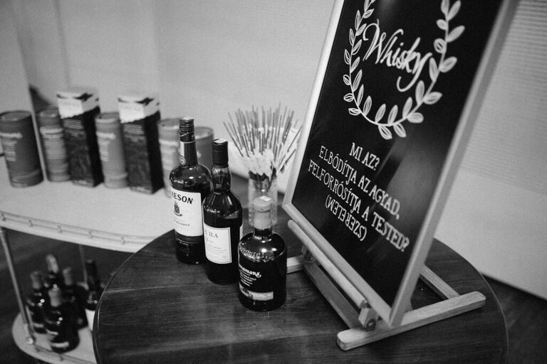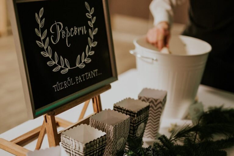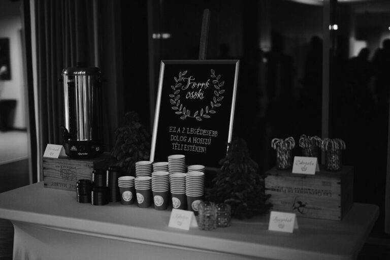 Dani nagy whisky rajongó, így nem is volt kérdés, hogy lesz egy whisky bár. Emellett volt még forrócsóki bár, egyedi logózott poharakkal és cukorpálcákkal, illetve popcorn bár, amihez kis popcorn dobozokat is kihelyeztünk.