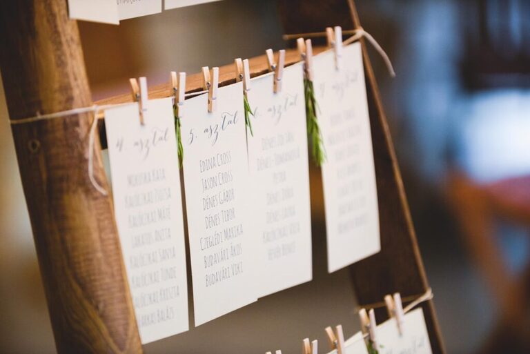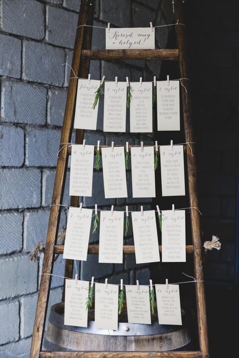 Ültetési rendnek egy létrára csipeszelt megoldást alkalmaztunk, külön kis papírkákat csipeszeltünk fel, amin a vendégek asztalonkénti beosztást találtak. A levendula is egy visszatérő elem volt az esküvő kapcsán, megjelent a meghívóban is, illetve az ültetési rendre is csipeszeltünk kis levendula szálakat.