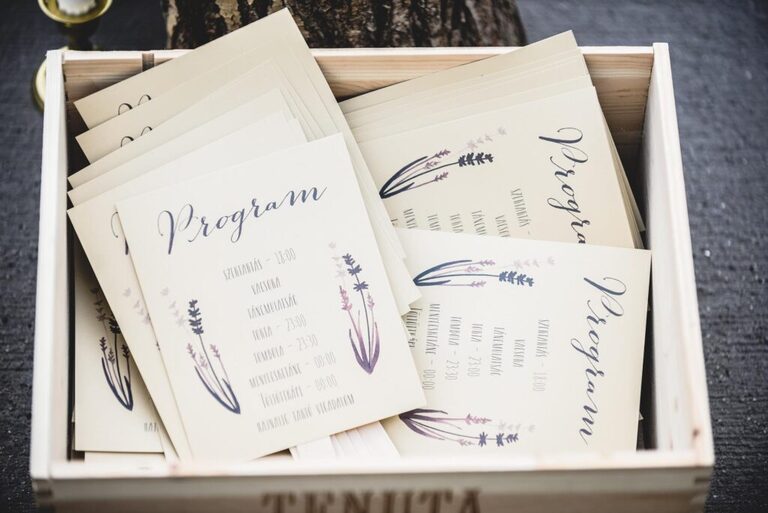 A meghívókat illetően minden vendég kapott egy kis meghívós csomagot, amely több lapból állt össze, minden lapon más és más információ szerepelt. A grafika az esküvő stílusában mutatkozott meg, a levendula szimbólumot használtuk, illetve a bordó színt. A meghívójuknál megjelent egy logózott parafadugó is, egy mágnest ragasztottunk rá, így hűtőmágnesként is funkcionált.