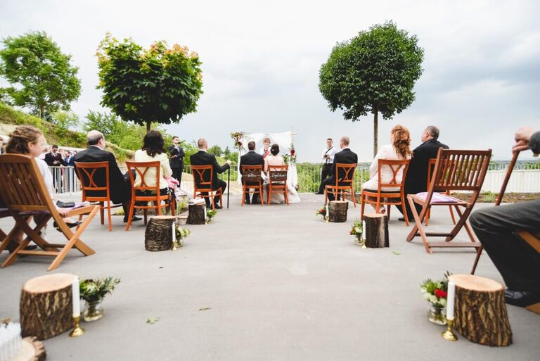 A szertartás helyszínt a dekorációval mindenképpen szerettük volna kellően feldíszíteni. A bevonuló út mentén elhelyeztünk farönköket, gyertyákat, illetve virágokat, ezeket a széksorok mellé tettük. Illetve természetesen egy boldogságkaput is készítettünk, ami előtt a pár kimondta a nagybetűs IGEN-t.