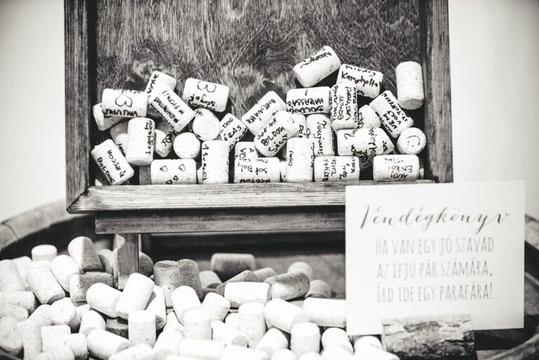 Vendégkönyvnek parafadugós vendégkönyvet készítettünk, ez egy fából készült képkeret plexi előlappal, felül kerek lyukkal, így az aláírt dugók könnyedén bedobhatóak a keretbe. A kép hátulja leszerelhető, így a dugók utólag elrendezhetőek benne.