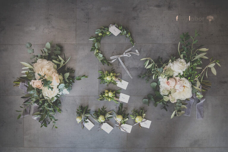 Készültünk személyes virágokkal is, a menyasszonyi csokor mellett készítettünk még férfi kitűzőket, koszorúslány csokrokat, illetve kislánynak fejdíszt.