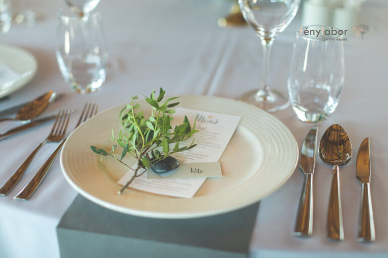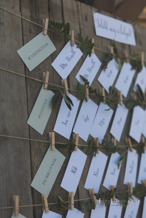 Az asztalok különböző helyekről kapták a nevüket, ahol korábban a Pár már járt együtt, illetve a zöld vonalat tekintve, minden terítékre tettünk vegyesen különböző eukaliptuszokat és pisztáciát.