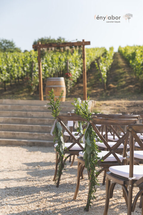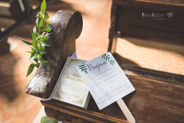 A polgári és a templomi szertartáson is az első sorokat névkártyákkal megjelöltük a közeli család részére, illetve a székek belső részét szalaggal és zöld növénnyel díszítettük.