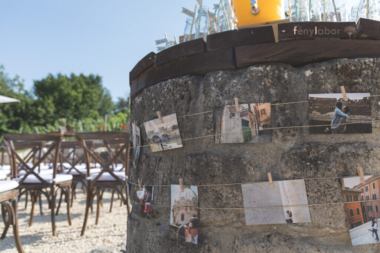 Vendégkönyvet tekintve, Csilláék a kavicsos megoldást választották, itt a kavicsokra tudtak írni a vendégek, majd pedig egy dobozba beledobhatták. A kavicsok ki voltak helyezve a terítékeknél, illetve egy halomban is ki voltak helyezve a tartó mellett.