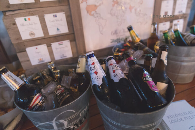 Zöld-fehér-púder stílust követtünk a dekorációt tekintve. Az ültetőtábla előtt alakítottunk ki egy sörbárt, aminél kihelyeztünk egy térképet, itt minden egyes országot megjelenítettünk, ahol korábban kóstolt már sört a vőlegény. A sörbárba különféle sörökkel készült a pár, illetve mindegyikhez készítettek egy leírást is, amit érdekességnek el is olvashattak a vendégek.