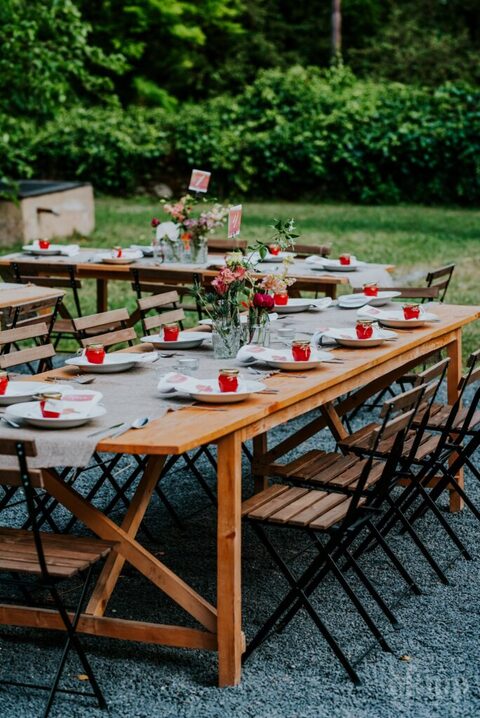 A vacsora kinti helyszínen került megrendezésre, fa asztalokkal, székekkel, magyaros piros színnel és az asztal közepét virággal díszítettük.