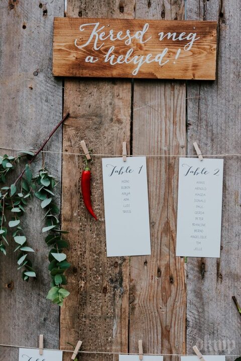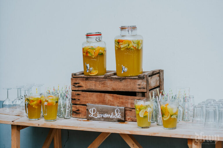 Az esküvő stílusa laza hangulatú volt, a vendégváráson helyeztünk el egy limonádébárt, a söröket hűtve talicskába tettük ki, illetve készítettünk raklapra egy menetrendet is a nagy napról, erre két nyelven írtuk ki a programpontokat.