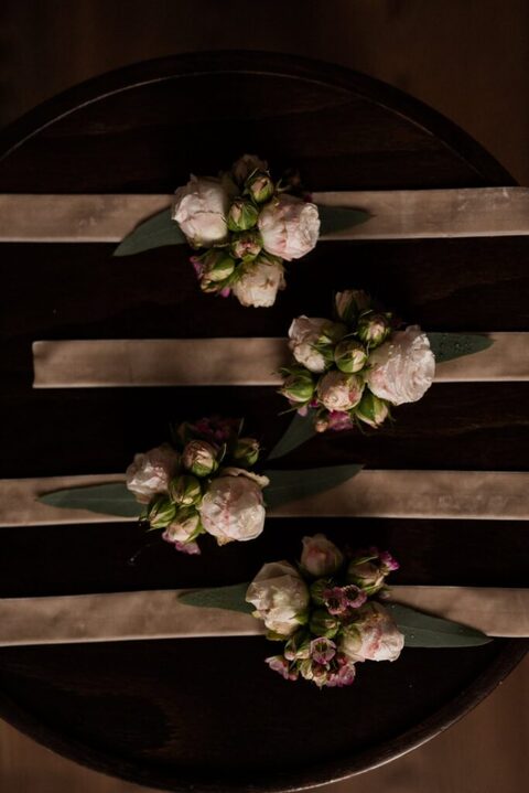 Személyes virágoknál a menyasszonyi csokor mellett még férfi kitűzőket, illetve kislány fejdíszt is készítettünk.