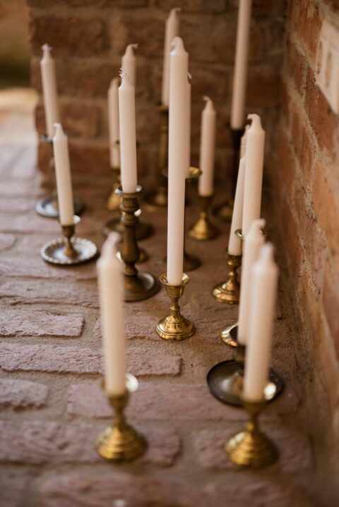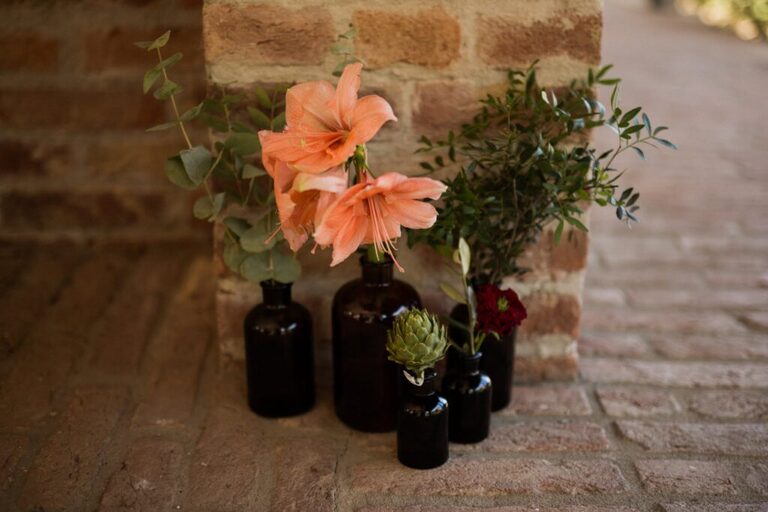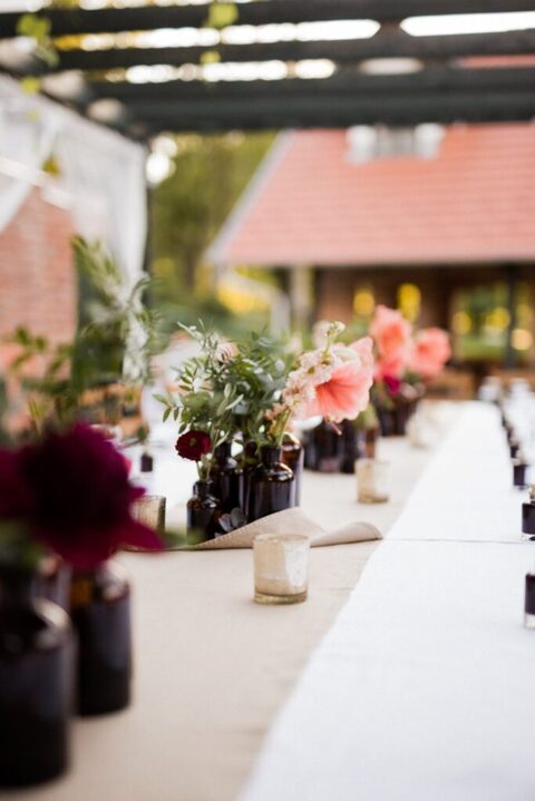 Dekorációs elemekként réz gyertyatartókat használtunk, a barna üvegek visszatérő motívumok voltak, az egész koncepció pedig bordó-barack virágokra épült, nagyon illett az Őrség hangulatához.