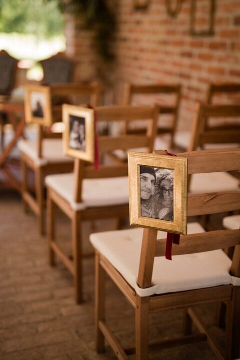 A templomi szertartás mellett a helyszínen, a Kosbor panzióban még polgári szertartást is volt. A bevonuló utat képekkel díszítettük, a székekre akasztottuk fel őket, illetve itt is helyeztünk el különböző táblákat.