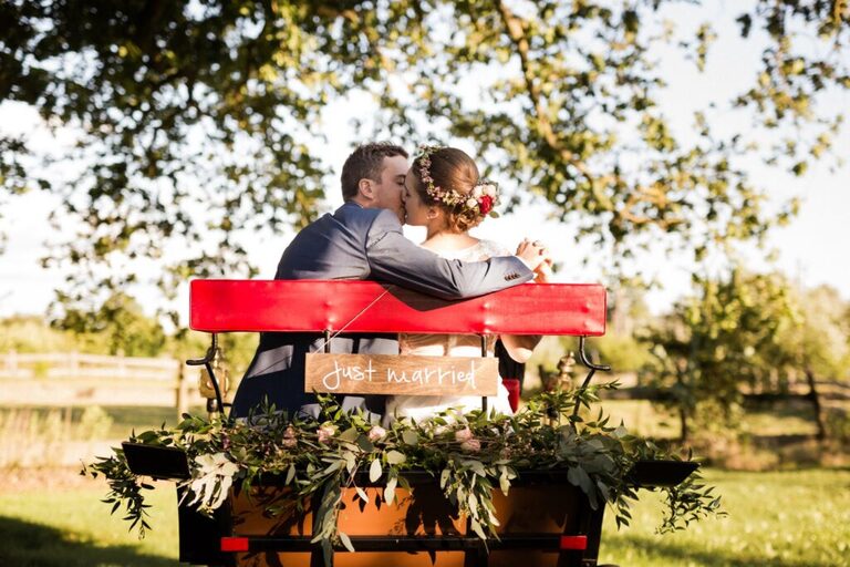 A Pár a templomból az esküvő helyszínére lovas hintón érkezett meg, amelyet virággal is díszítettünk, illetve elhelyeztünk rajta egy “Just Married” feliratot.