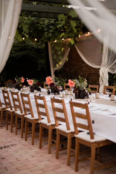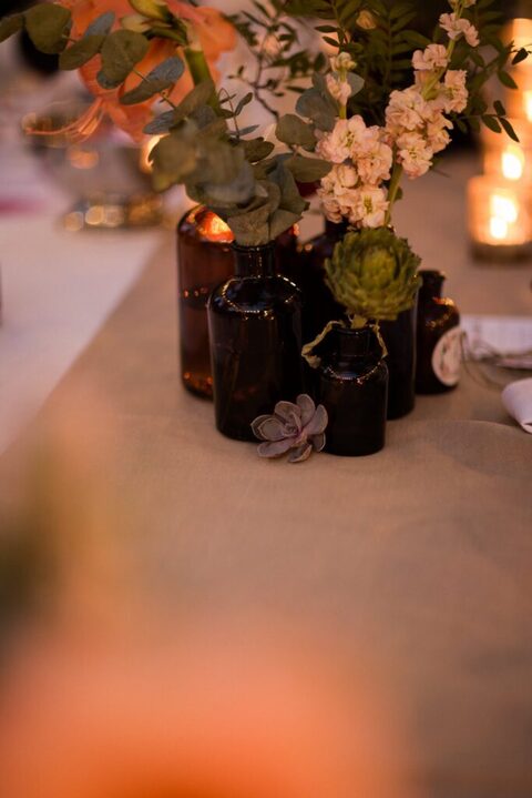 Az asztalokat pár szál virággal díszítettük, ezeket vázákba helyeztük, illetve hosszú gyertyákkal is kiegészítettük. A vendégek egy hosszú asztalnál ültek, a Pár ült az asztalfőn, székeikre feliratot tettünk.