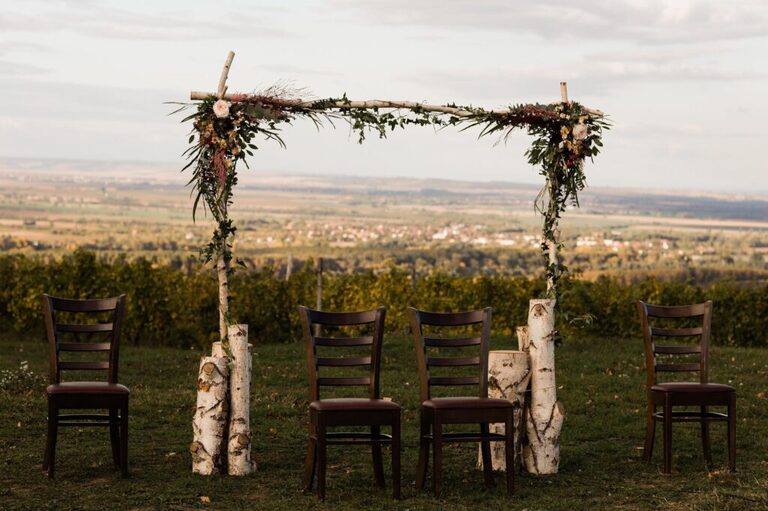 A szertartás fent volt a dombtetőn, kis visszafogott dekorral díszítettük a kaput, illetve a széksorok mellett csokrokat raktunk ki.