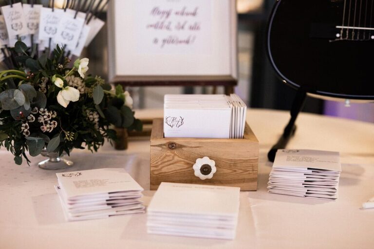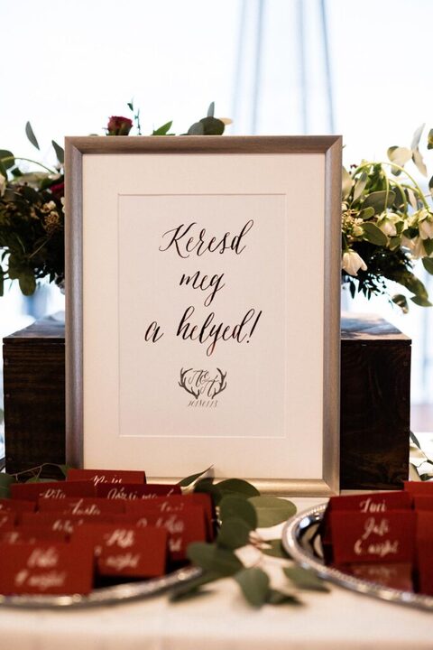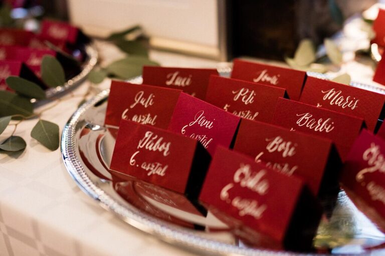 Az ültetési rend is különleges volt, bordó színű kártyákra írtunk neveket kézzel, ezeket pedig ezüst tálcán helyeztük ki asztalonként.