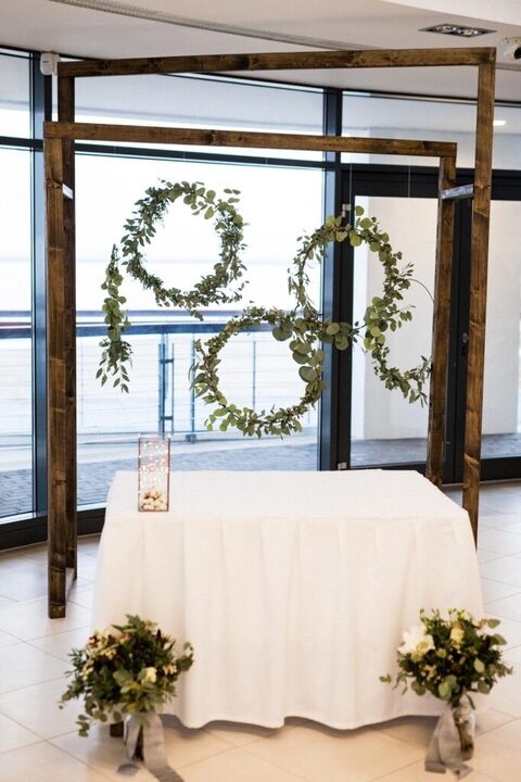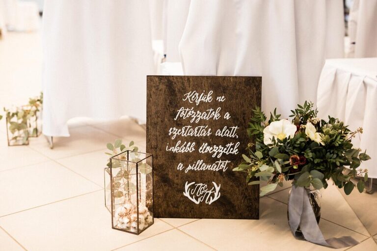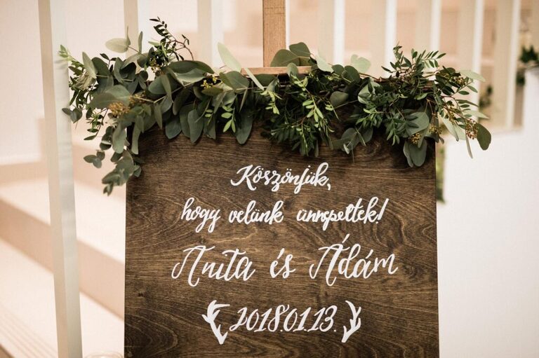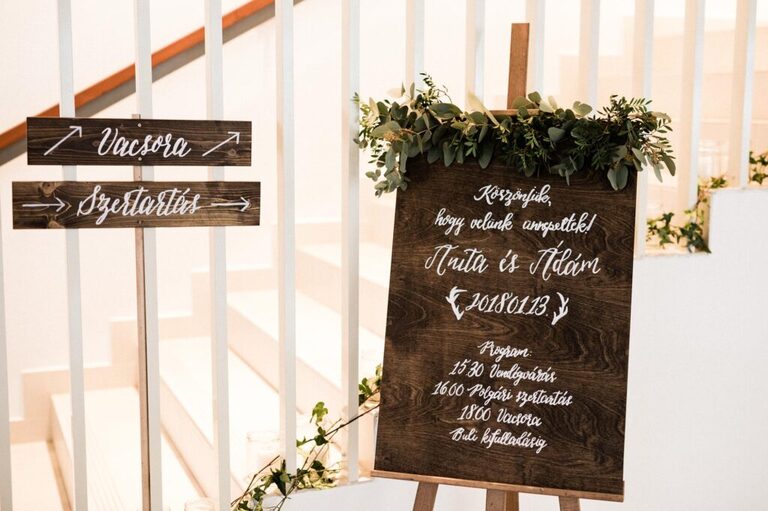Háttérnek zölddel bevont karika díszt helyeztünk ki, egyedi gyűrűtartóval is készültünk, illetve sok-sok táblát használtunk, amin különböző információkat tüntettünk fel.