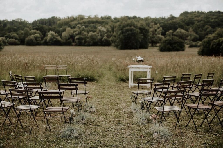 Polgári szertartásuk is volt, ez volt az egyik kedvenc részem a nagy napon. Lent a dombon volt a helyszínen, amit úgy alakított ki a pár, hogy sokáig hagyta, hogy nőjenek a vadvirágok, majd ebbe nyírtak egy kis ösvényt, aminek a végén volt egy kör, itt volt a szertartás és kör alakba helyezték ki a székeket is. Nagyon ötletes volt. :)