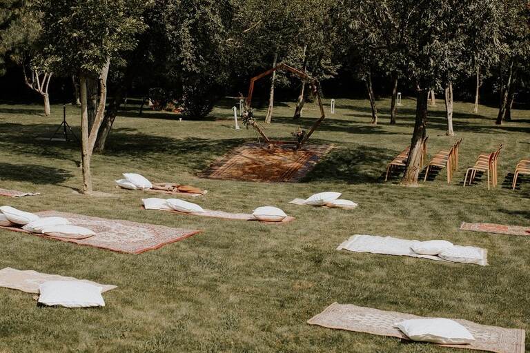 A szertartáson néhány szék volt elhelyezve, de a legtöbben szőnyegeken és párnákon ültek a domboldalon, így még intimebbé téve a pillanatot.