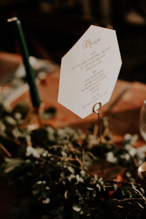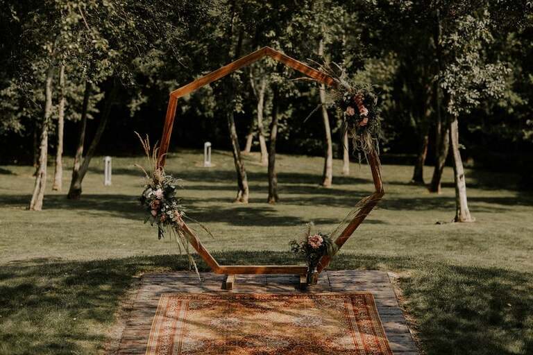 A boldogságkapu is visszatérő elem volt, melynek 7 szögletű formája nemcsak a kapuban, hanem a grafikai anyagokban is megjelent. A menük, asztalszámok és az ültetési rend mind 7 szögre vágott formában kerültek kialakításra, így az esküvő vizuálisan is harmonikus lett.