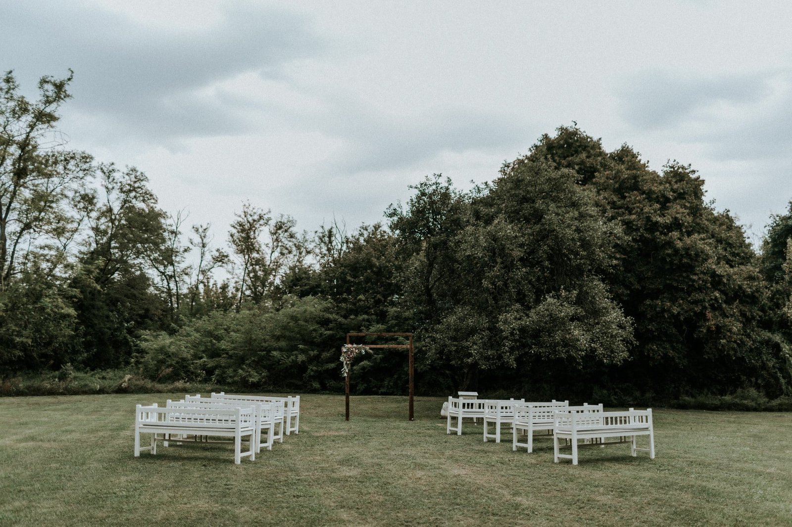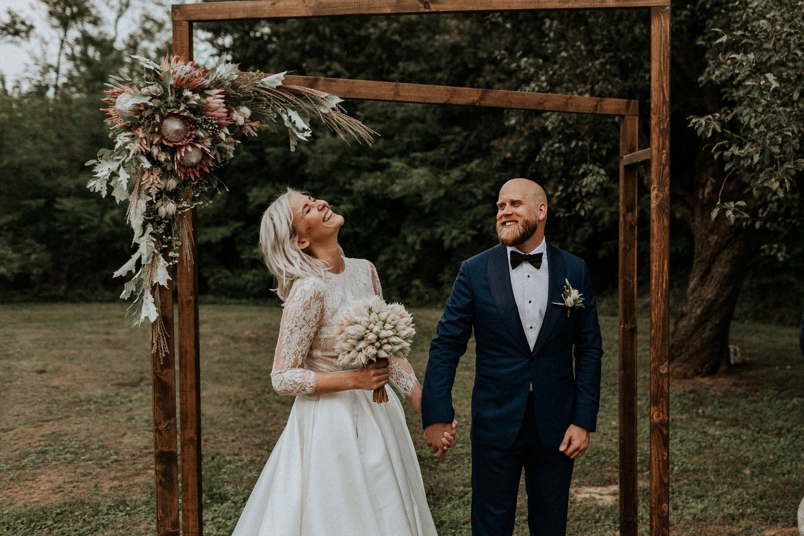 A szertartás helyszínén a Babérliget természetes környezete kapta a főszerepet: egy fa boldogságkaput használtunk, amelyet a protea virág díszített – elegáns, természetes, mégis látványos megoldásként.