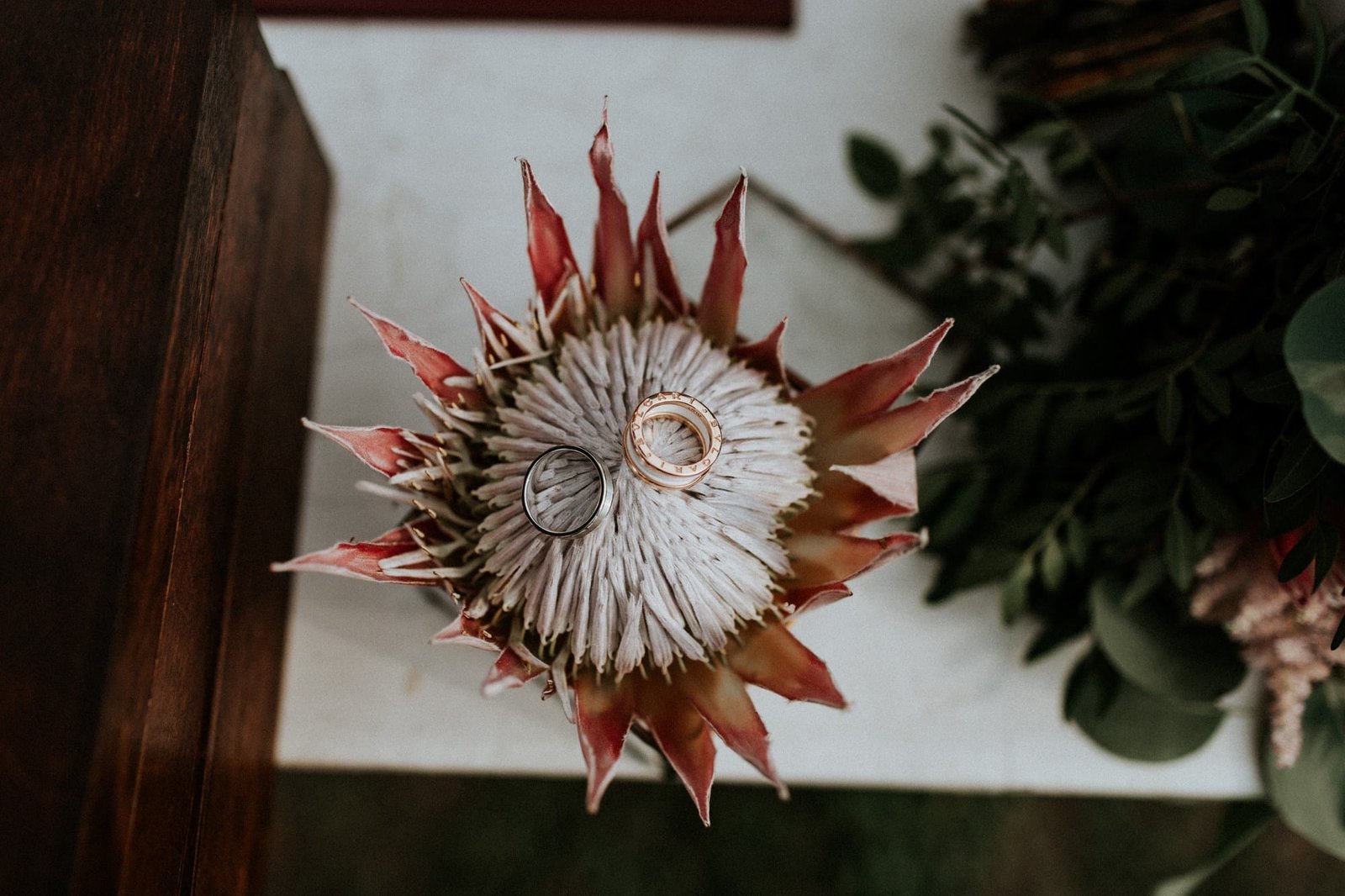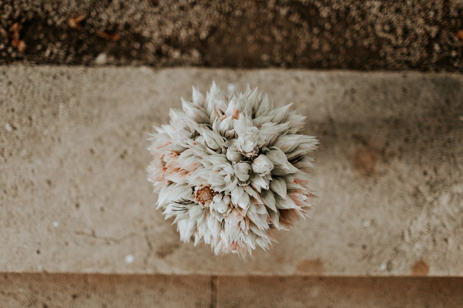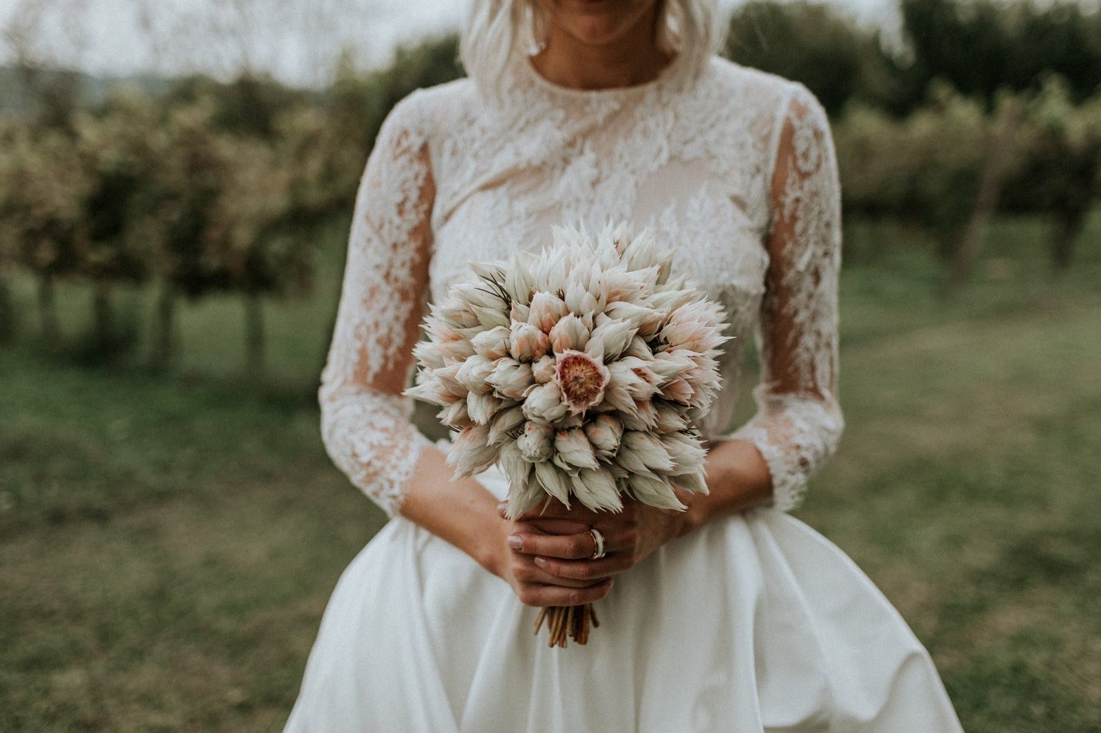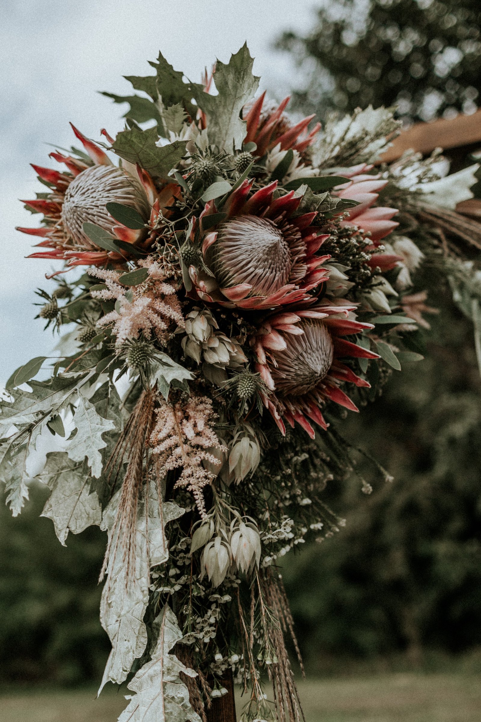 A dekoráció koncepcióját a protea virág inspirálta, amely a menyasszonyi csokorban is főszerepet kapott. A csokrot kizárólag seruria virágokból készítettük, így letisztult, mégis különleges hatást keltett.