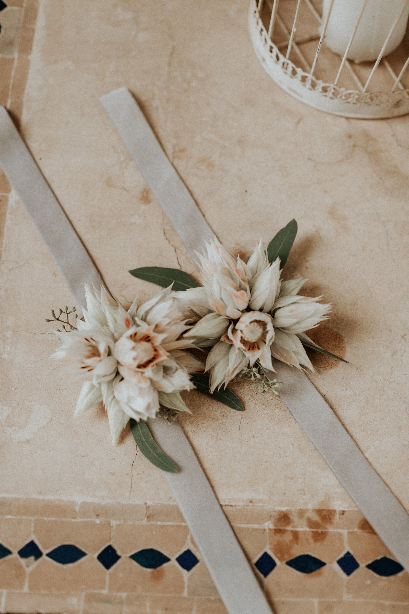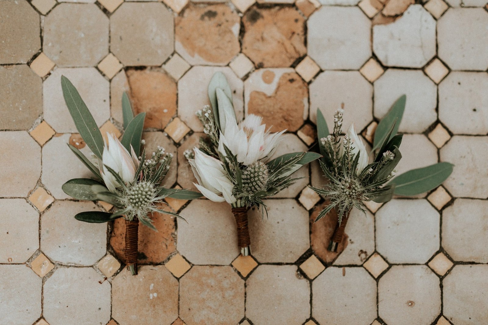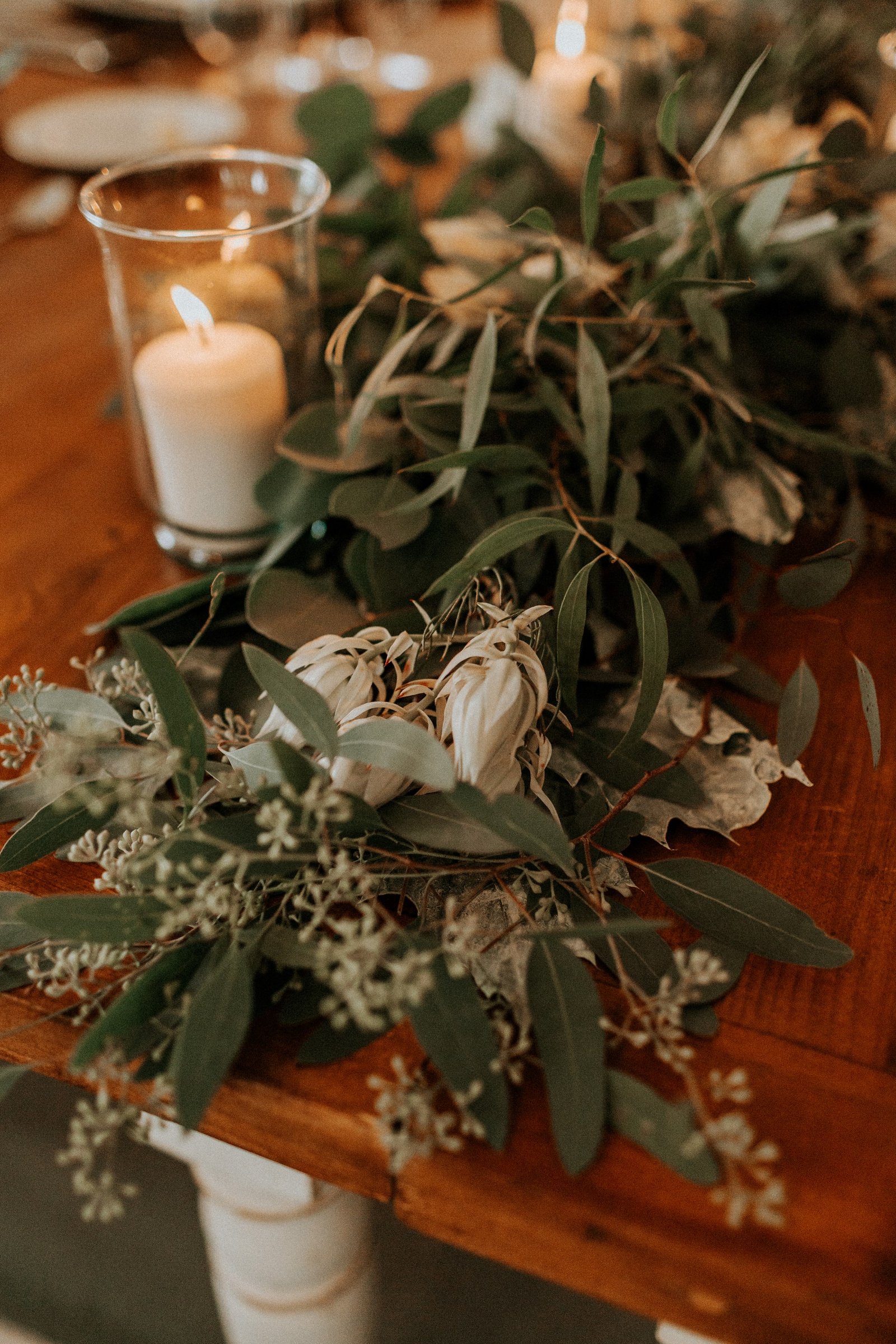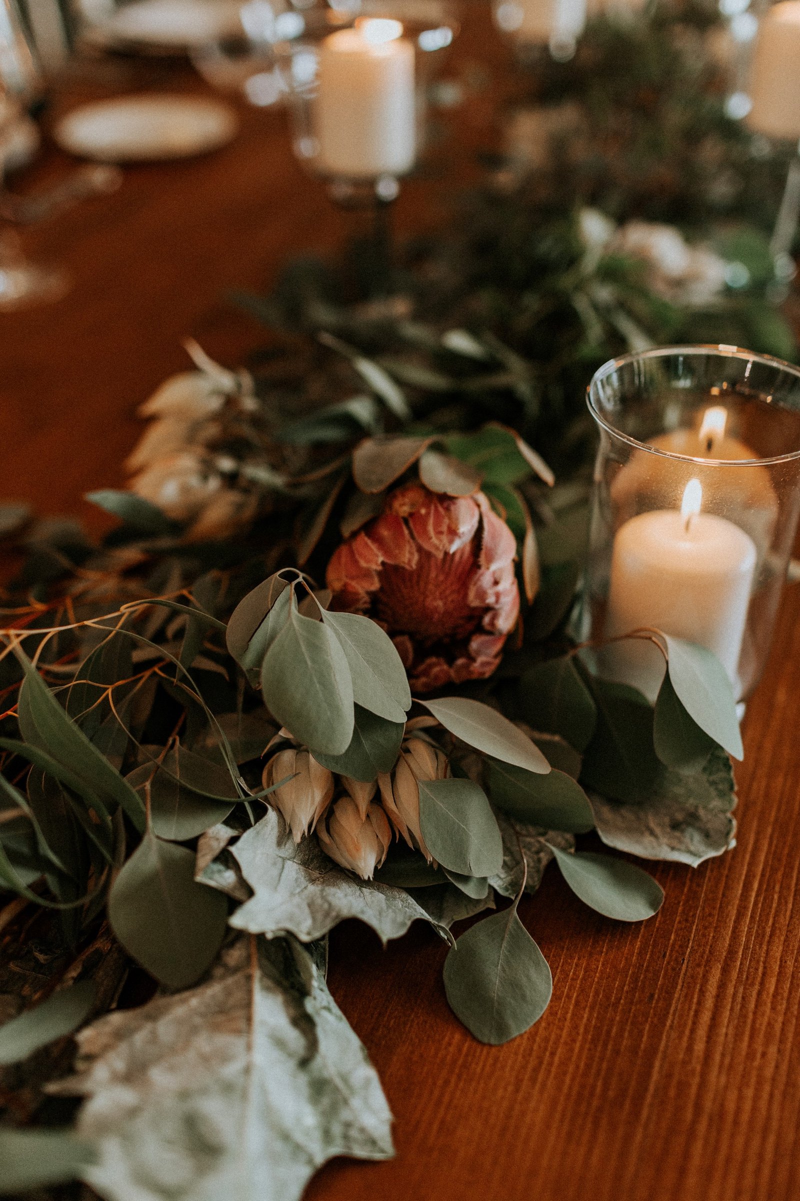 A dekoráció koncepcióját a protea virág inspirálta, amely a menyasszonyi csokorban is főszerepet kapott. A csokrot kizárólag seruria virágokból készítettük, így letisztult, mégis különleges hatást keltett.