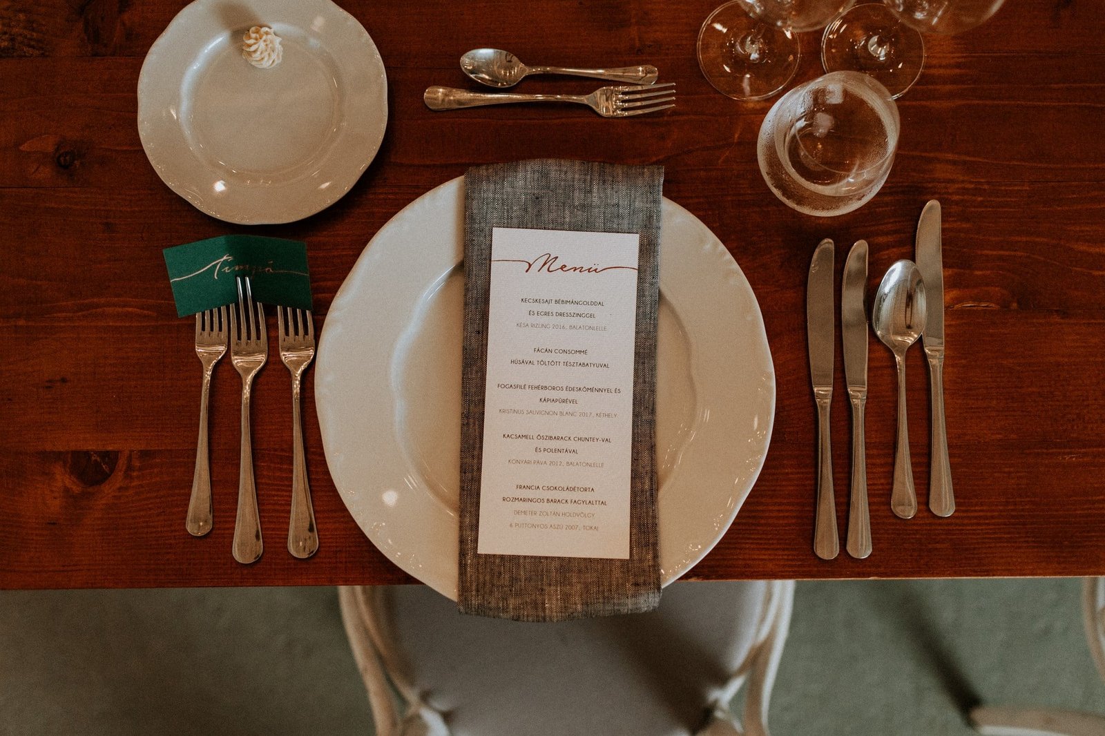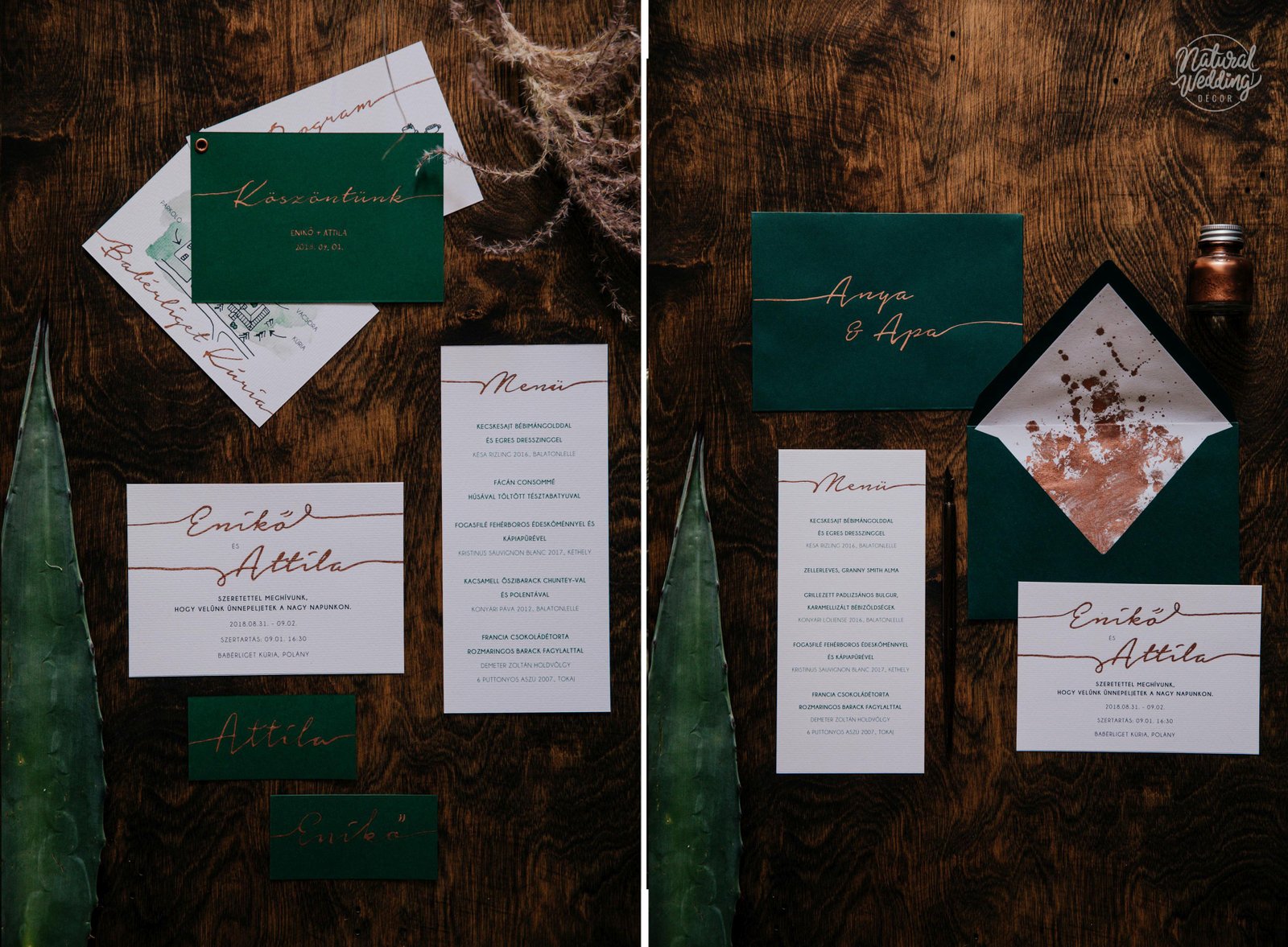 A meghívó dizájnját két markáns szín határozta meg: a sötétzöld és a bronz. Ezek a színek végigvonultak az egész esküvő arculatán, a dekorációtól kezdve a grafikai anyagokig. Ez a tudatos tervezés tette igazán összehangolttá és stílusossá az eseményt.