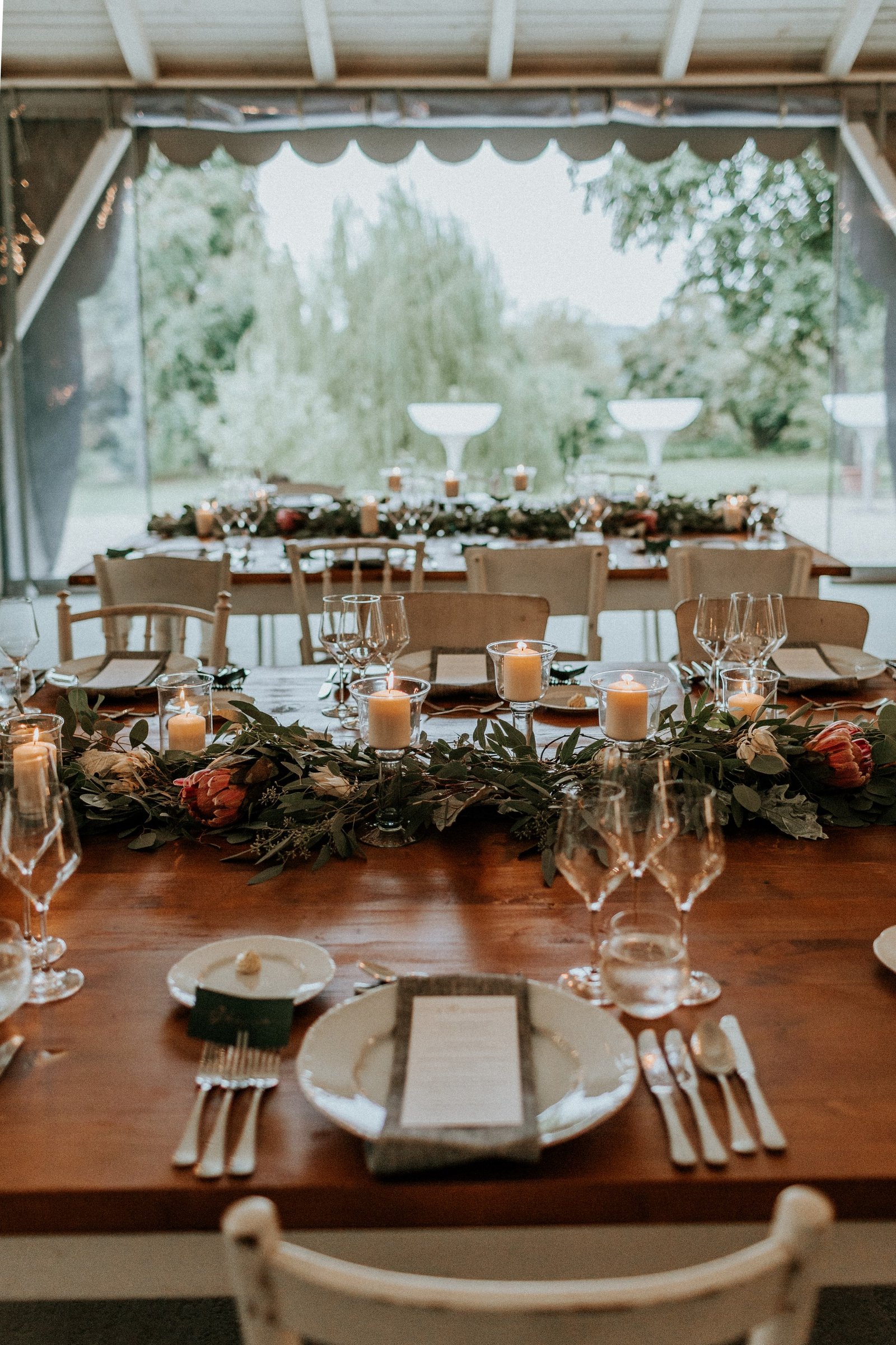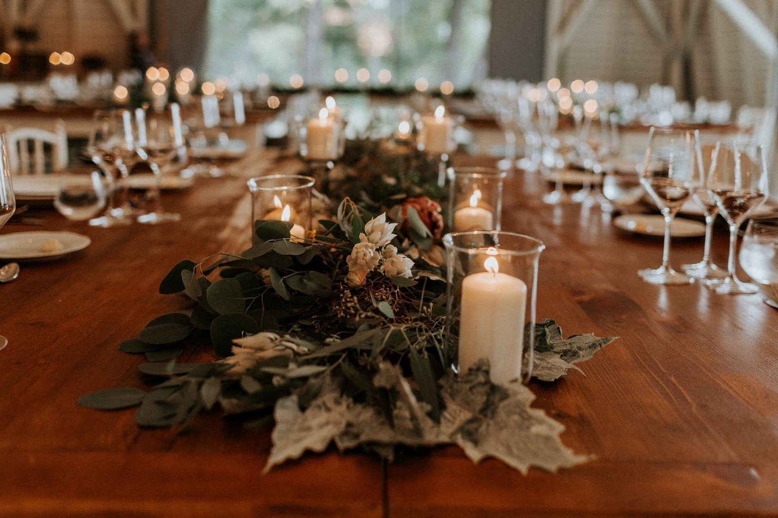 Az asztali dekorációban akkoriban divatos zöld asztali futó jelent meg, amit tömbgyertyákkal egészítettünk ki, ezzel teremtve meleg, meghitt hangulatot.