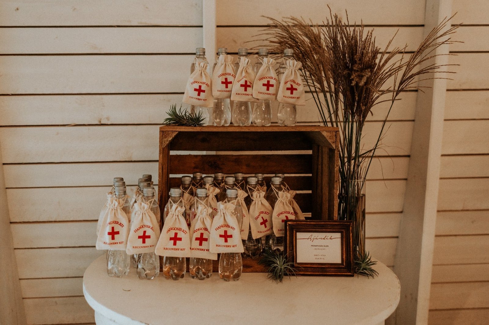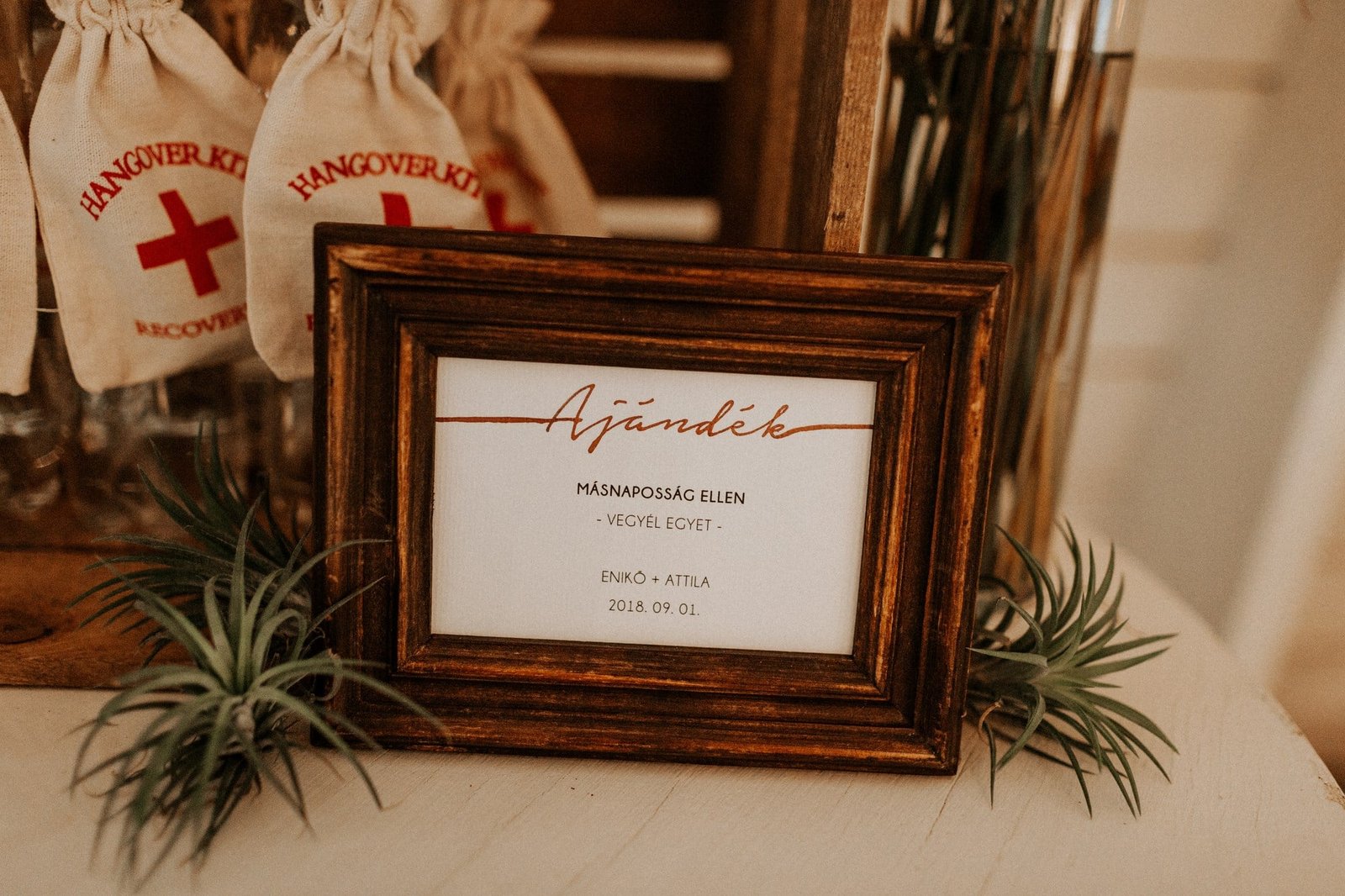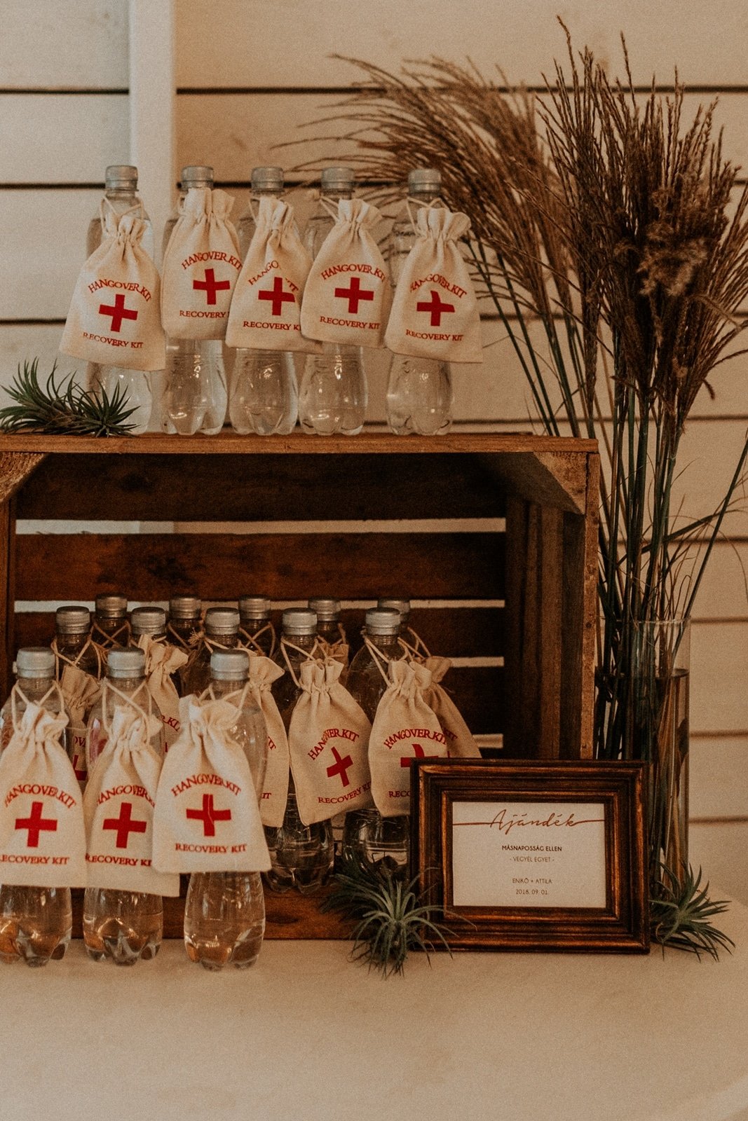 A vendégek egy kedves és praktikus meglepetést is kaptak: egy kis „másnapos csomagot”, benne apró hasznos dolgokkal, mint például rágó vagy aszpirin.